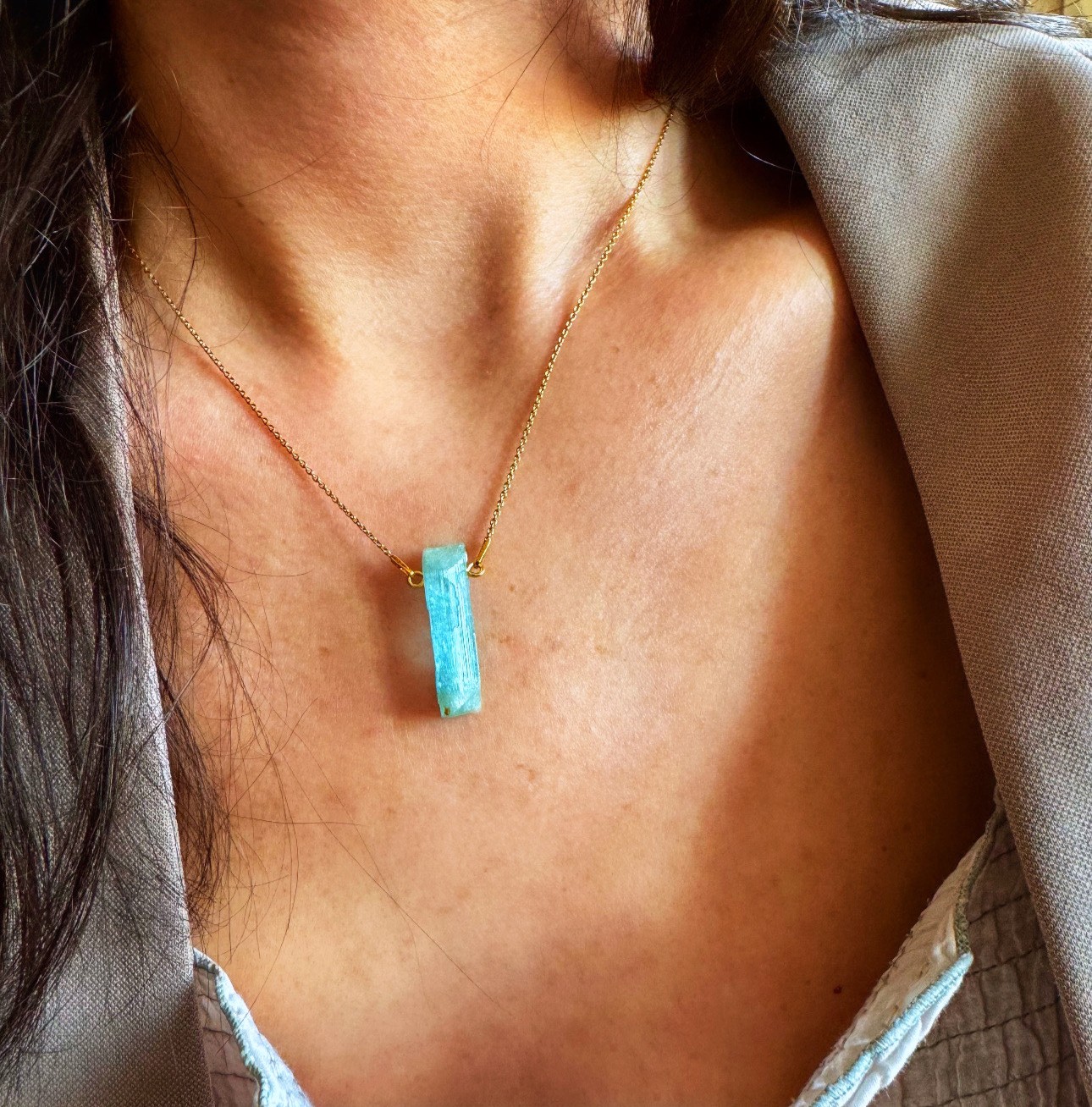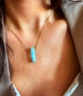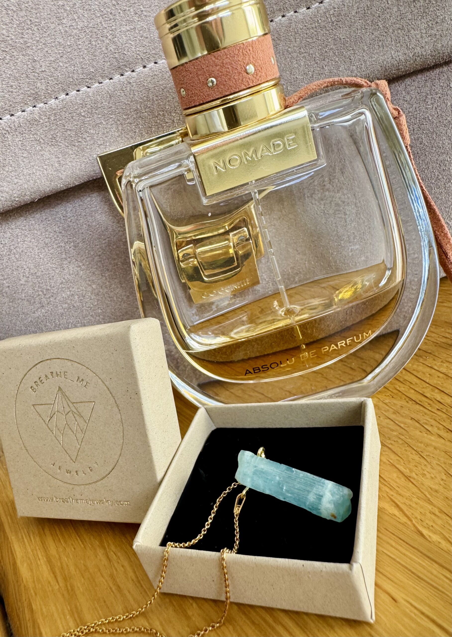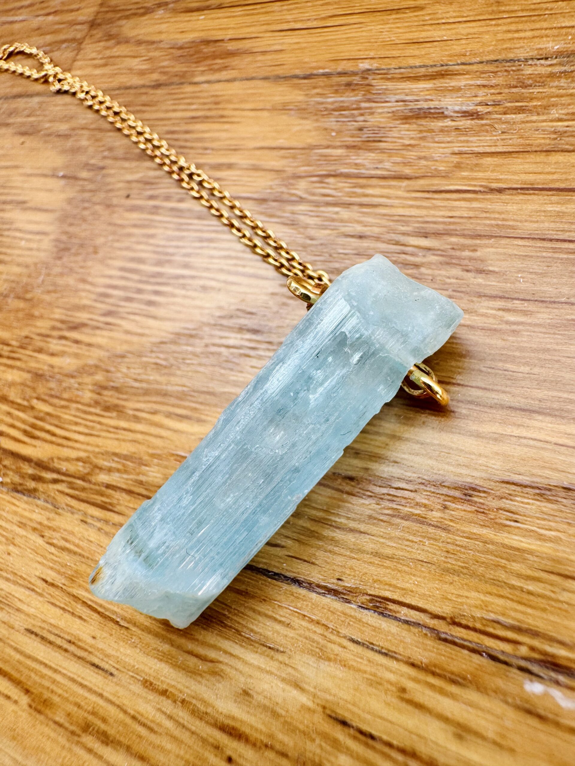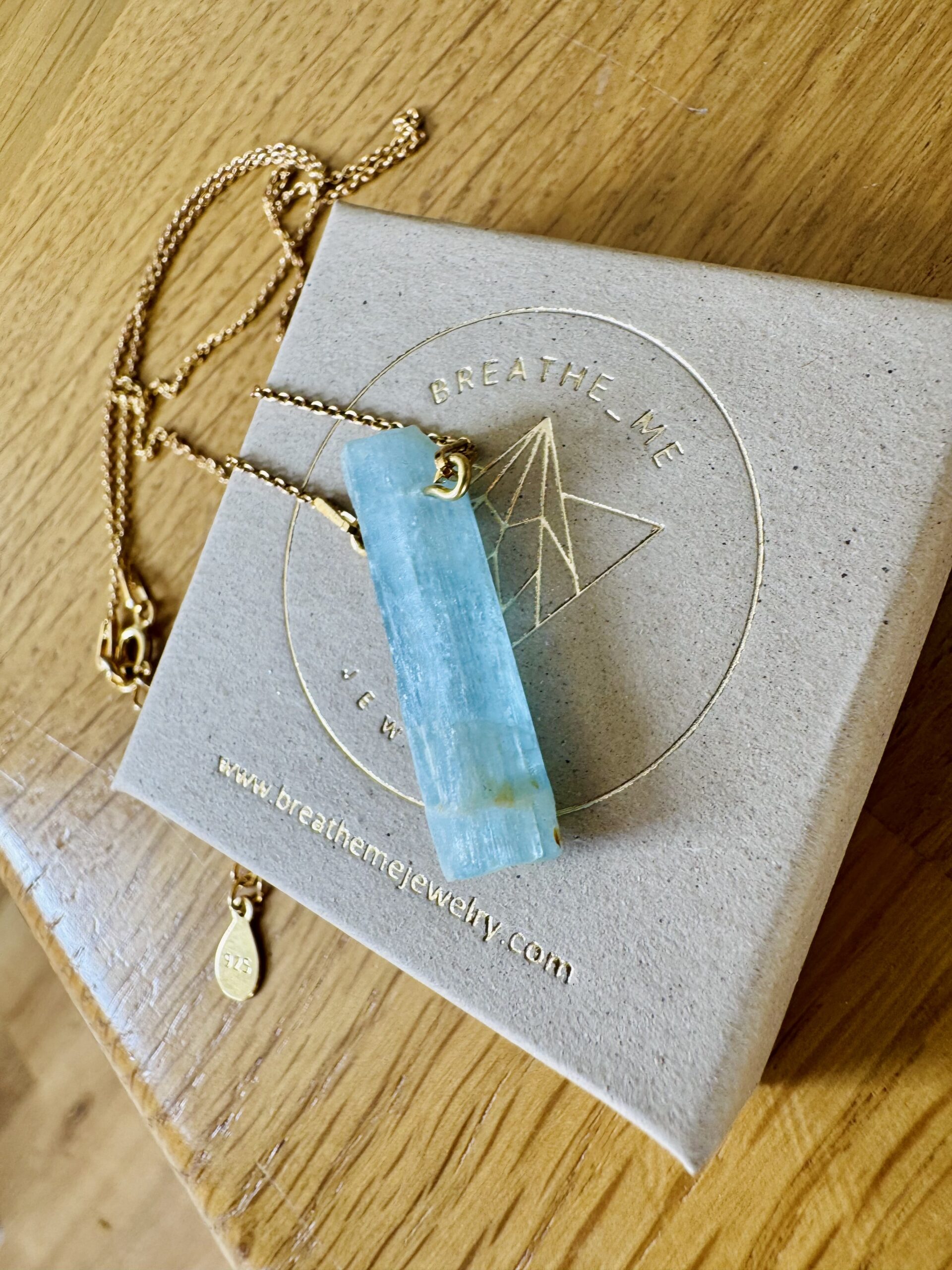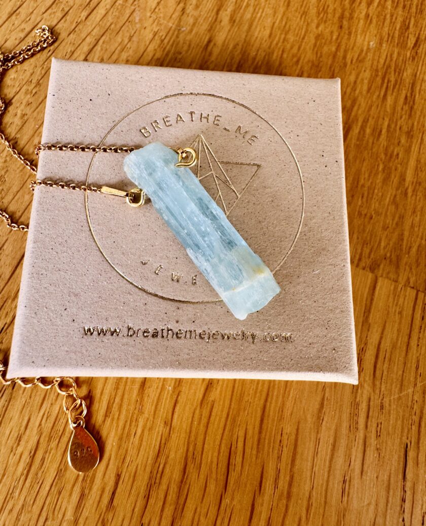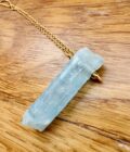 Naszyjnik z Akwamarynem – Kryształem Spokoju i Czystości Umysłu. Głęboki jak ocean, jasny jak letnie niebo… Akwamaryn to kamień, który niesie harmonię, ukojenie i wewnętrzny balans. Wspiera spokojną komunikację, dodaje odwagi i pomaga uwolnić się od lęków. W dawnych czasach nazywano go „kamieniem szczęśliwych podróży” – nie tylko tych w dalekie strony, ale i w głąb siebie.