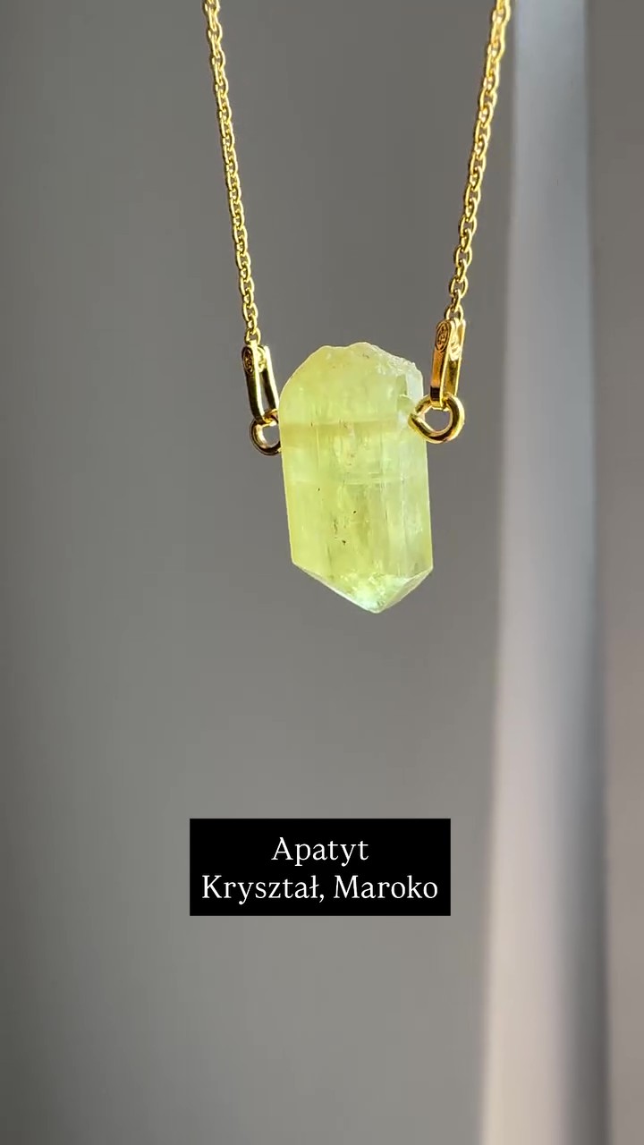 Naturalny apatyt został oprawiony ręcznie w solidny łańcuszek wykonany ze srebra próby 925, podwójnie pozłacanego czystym 24-karatowym złotem. Dodatkowa warstwa zabezpieczająca chroni złocenie, dzięki czemu naszyjnik zachowuje swój blask przez długi czas. Biżuteria jest hipoalergiczna i bez dodatku niklu.