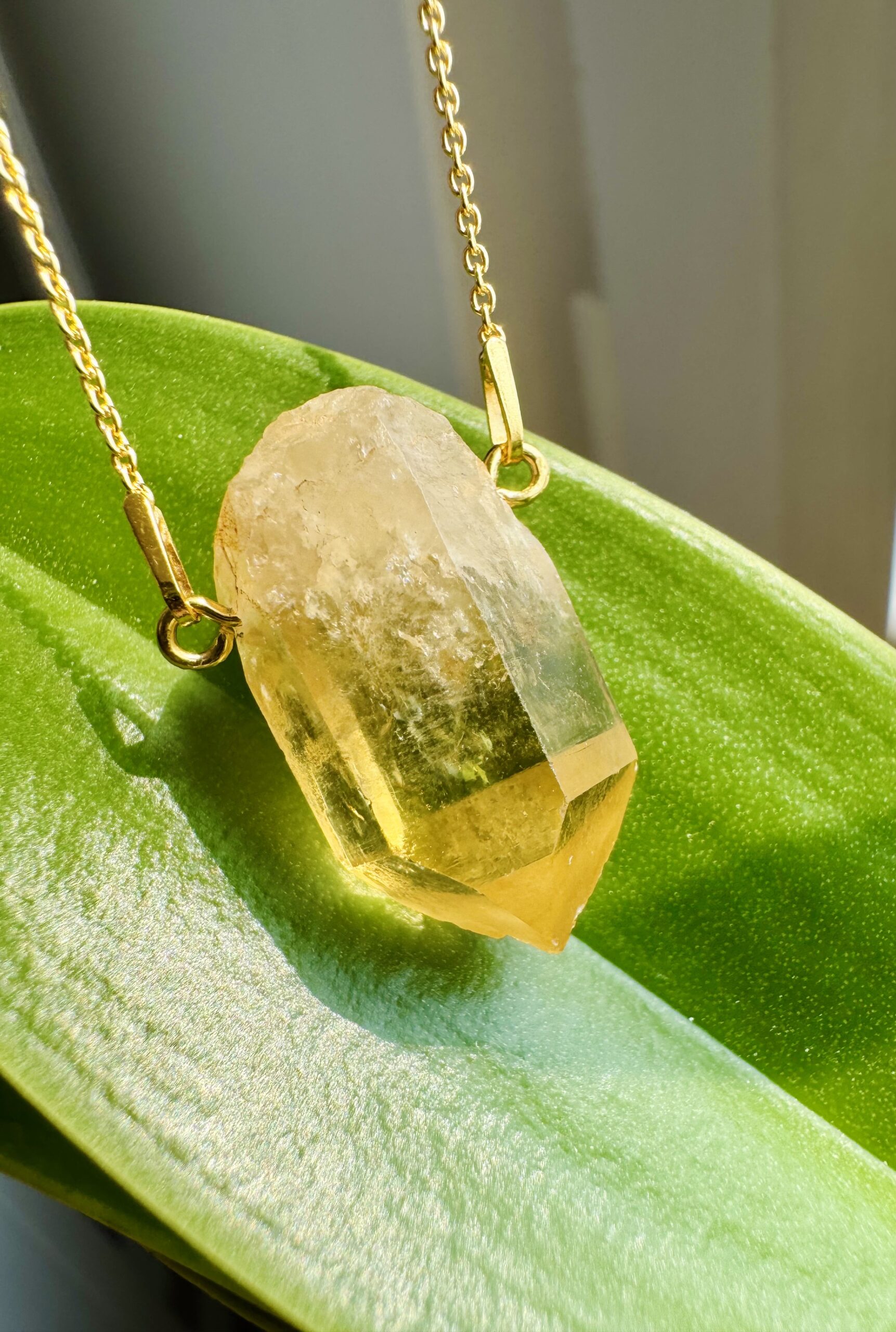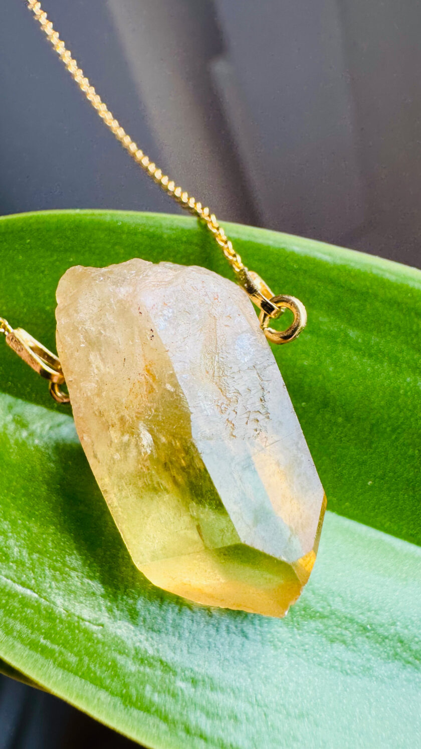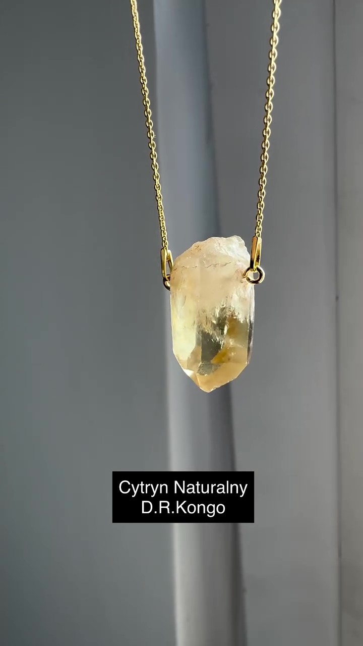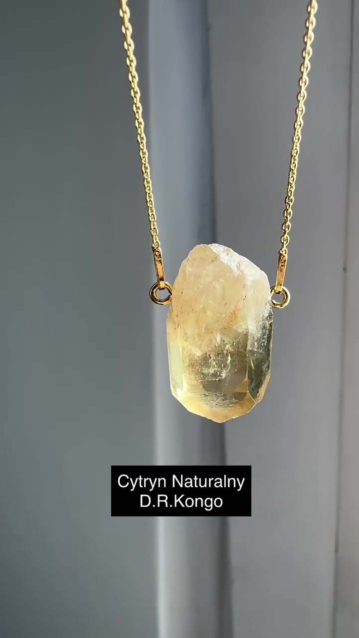 Naszyjnik z kolejnym zachwycającym okazem Naturalnego Cytrynu z Kongo oprawiony ręcznie w srebro podwójnie pozłacane 24K złotem. Cytryn jest w formie surowej, nieszlifowanej z zachowanymi wszystkimi ściankami kryształu. Ręcznie wykonany, naturalny i niepowtarzalny.