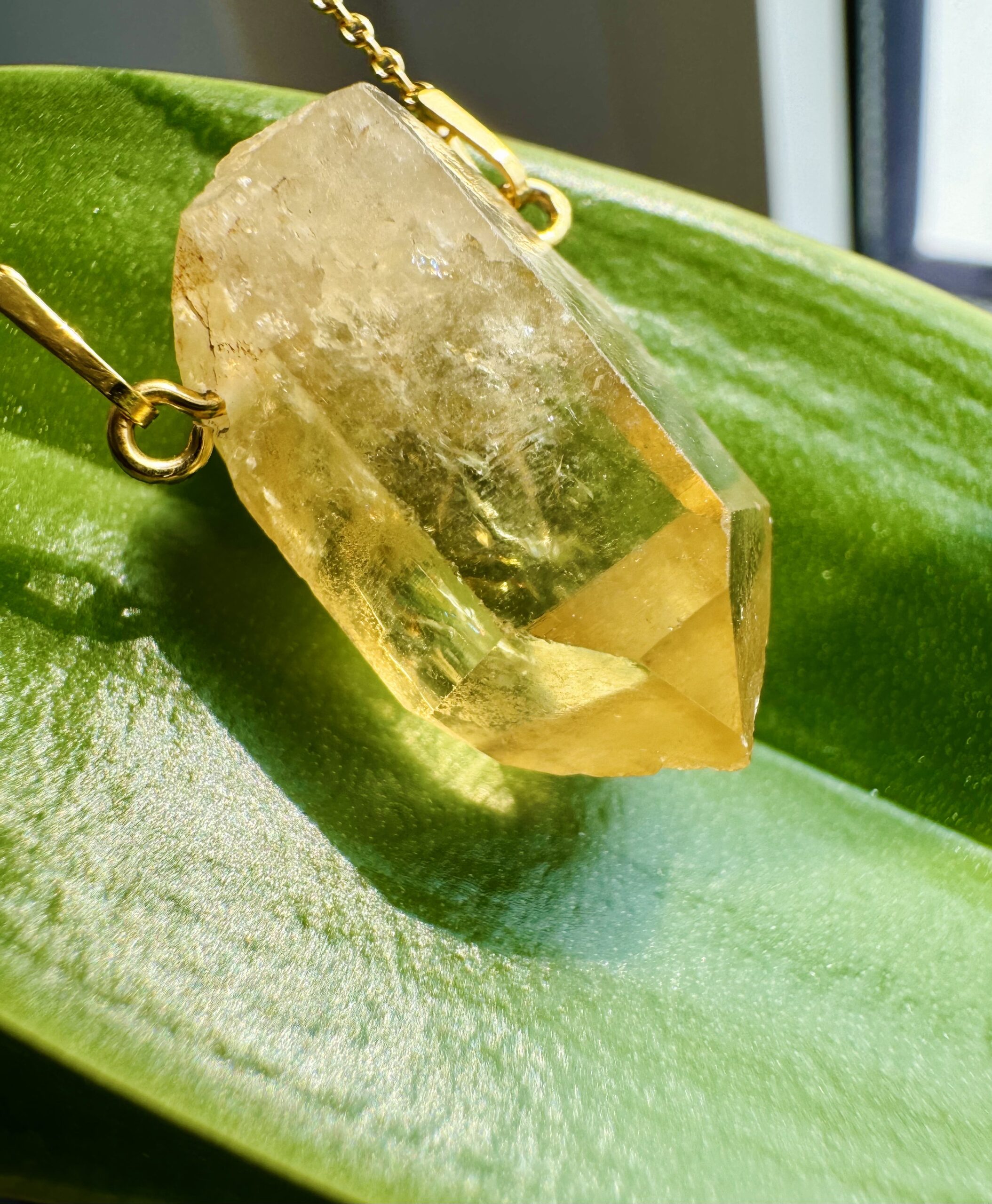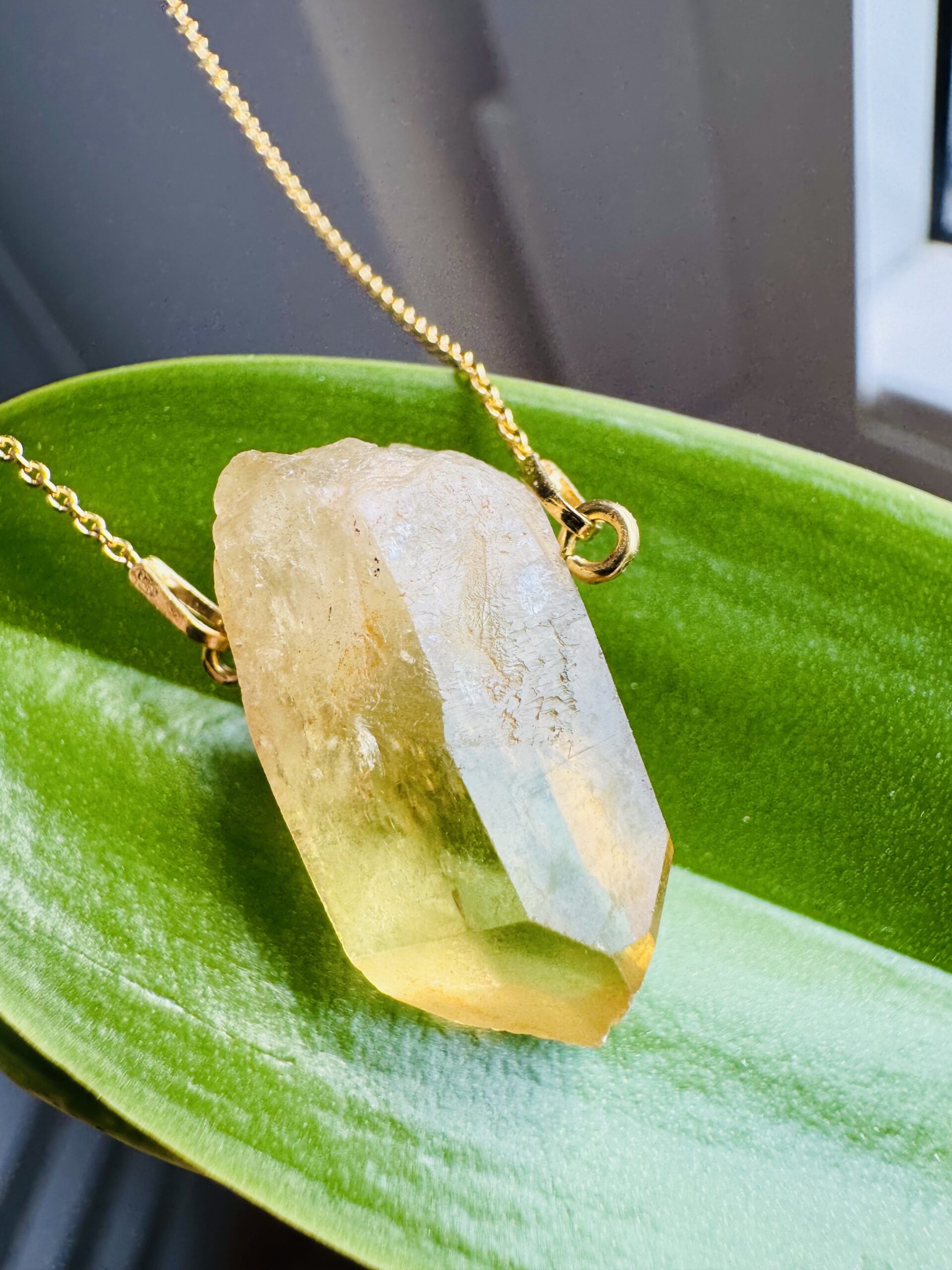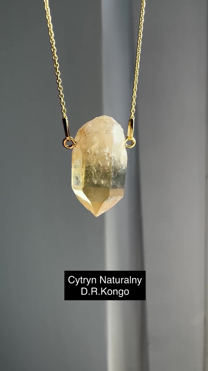 Naszyjnik z kolejnym zachwycającym okazem Naturalnego Cytrynu z Kongo oprawiony ręcznie w srebro podwójnie pozłacane 24K złotem. Cytryn jest w formie surowej, nieszlifowanej z zachowanymi wszystkimi ściankami kryształu. Ręcznie wykonany, naturalny i niepowtarzalny.