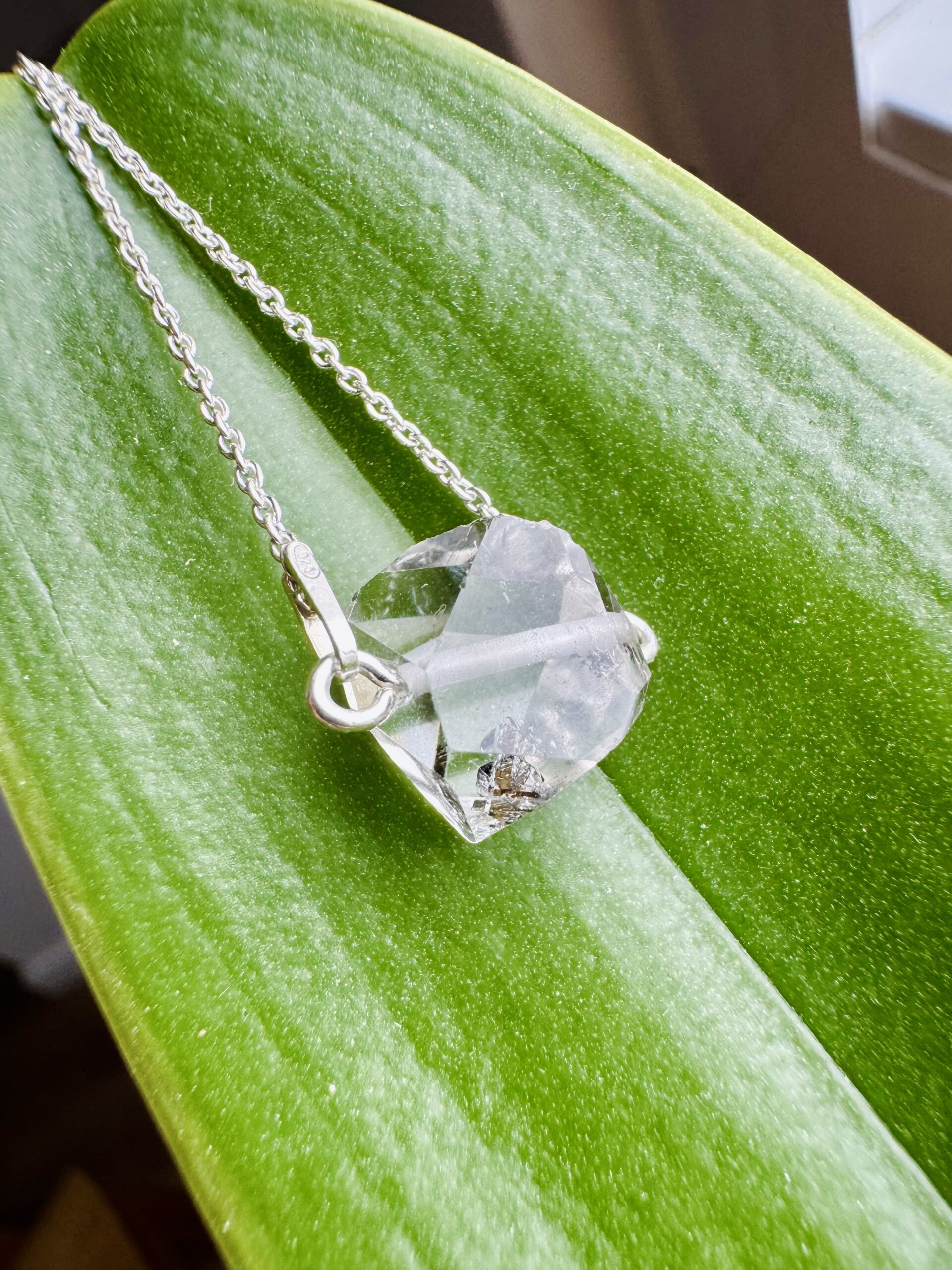 Odkryj wyjątkowy naszyjnik z naturalnym kryształem Herkimer Diamond, wydobywanym tylko w jednym miejscu na świecie — w Herkimer County, Nowy Jork (USA). To autentyczny, surowy kryształ o niezwykłej przejrzystości i świetlistości, który od lat cieszy się uznaniem wśród miłośników energetycznej biżuterii oraz kamieni naturalnych. Istnieje możliwość wybory wykończenia – łańcuszek srebrny pozłacany lub srebrny bez złocenia.