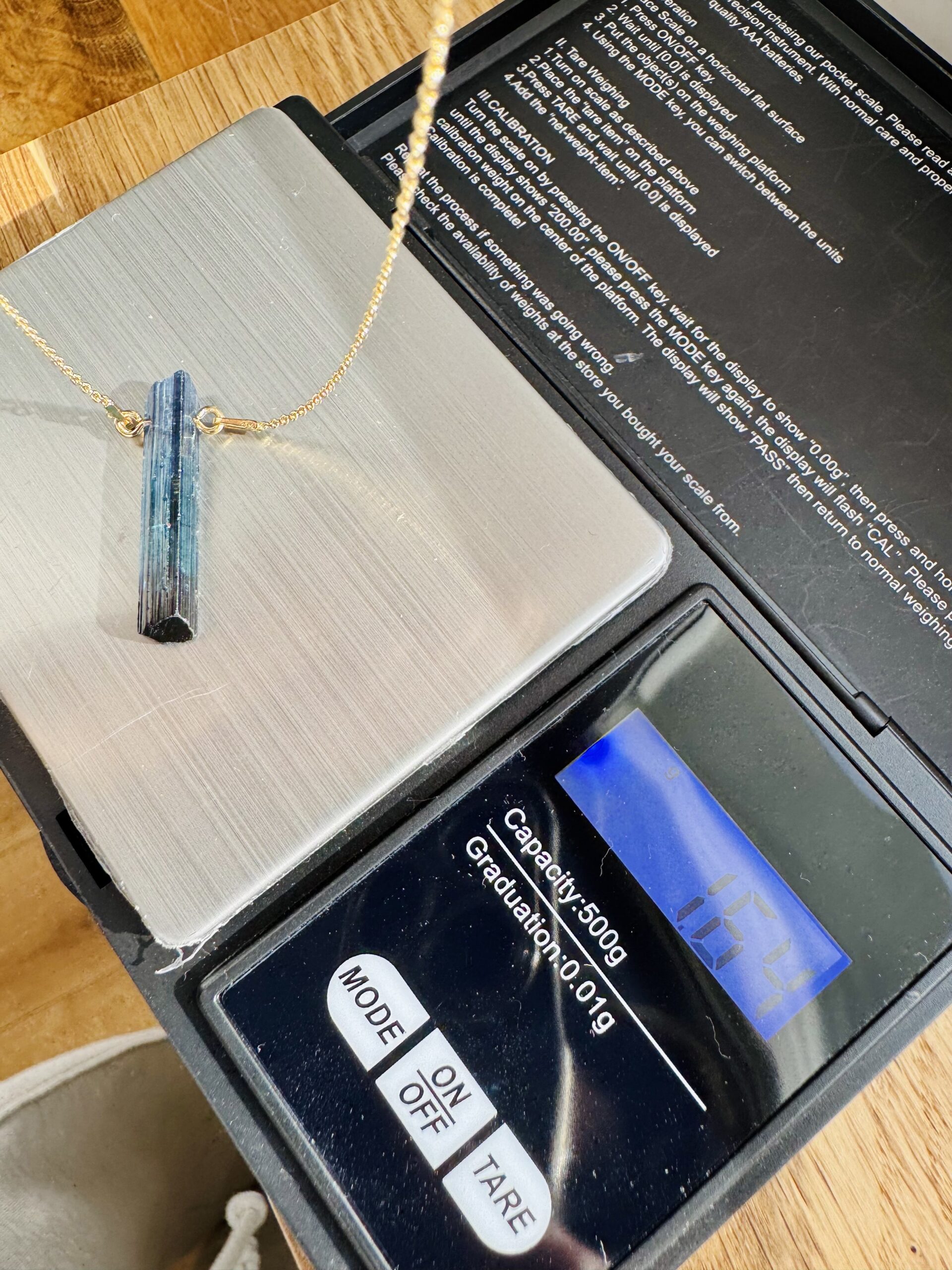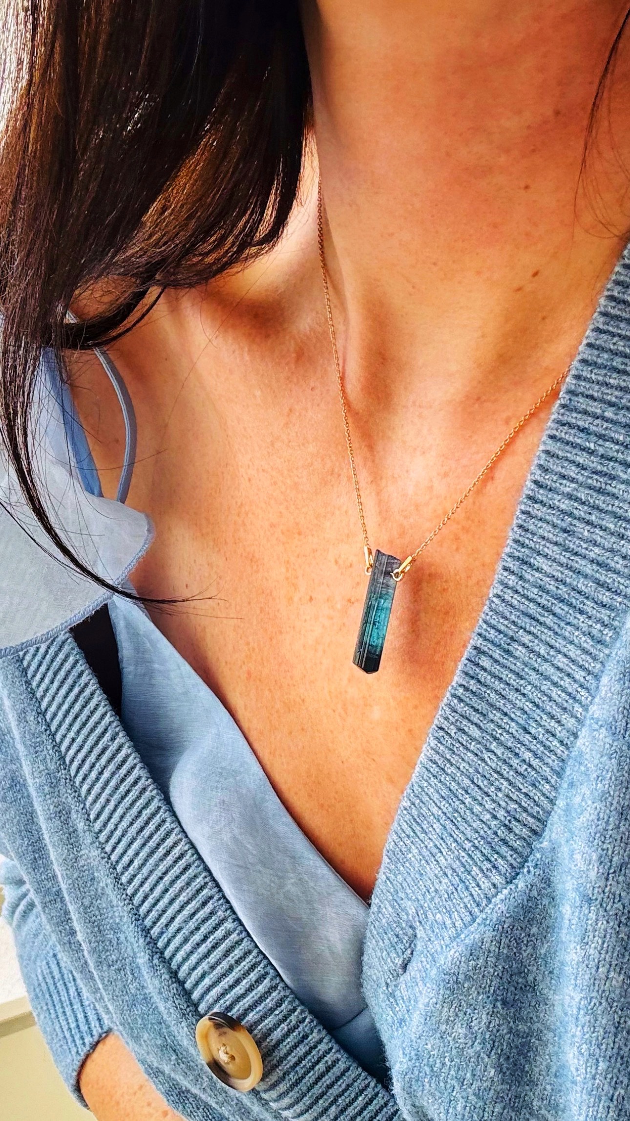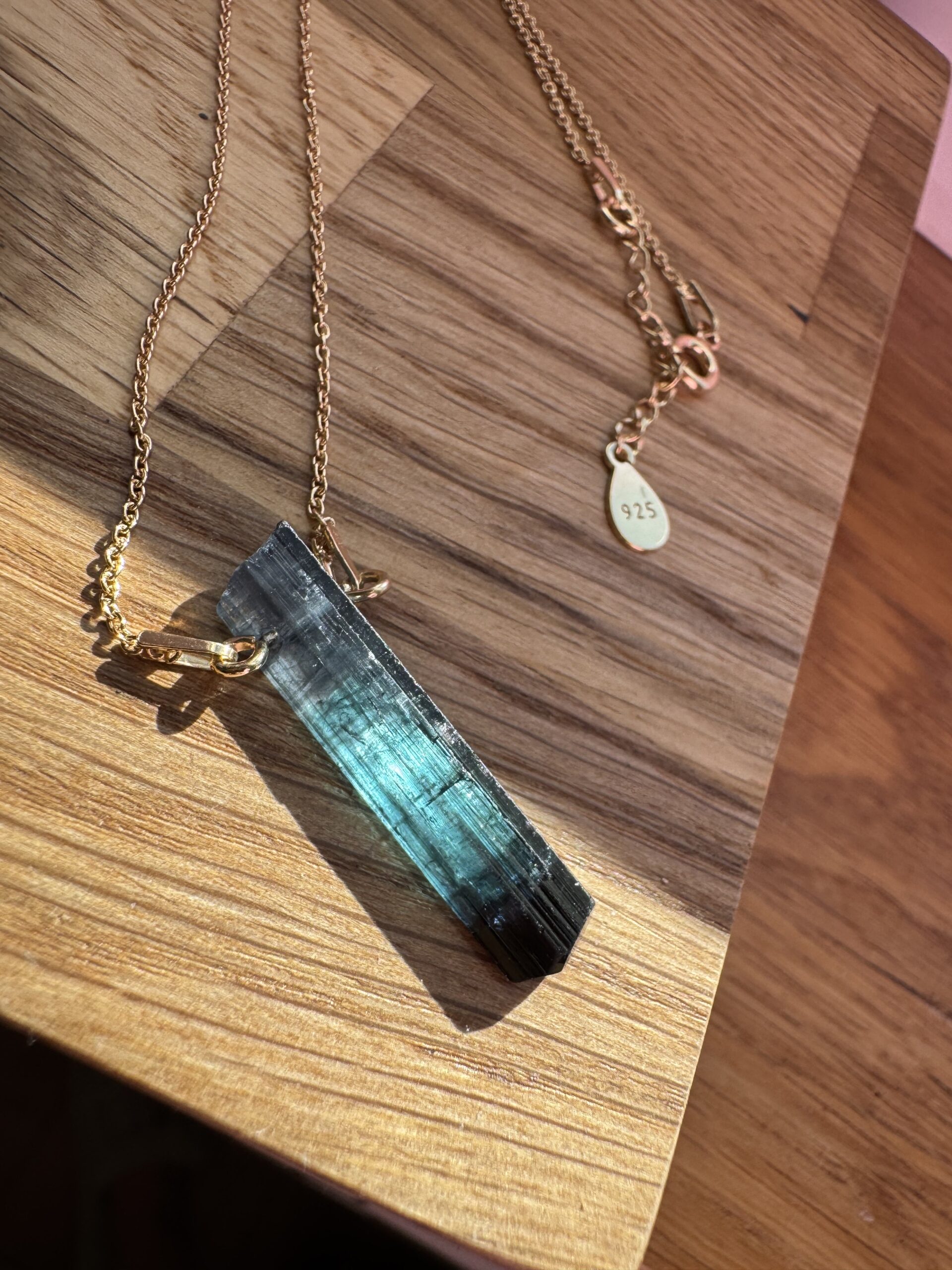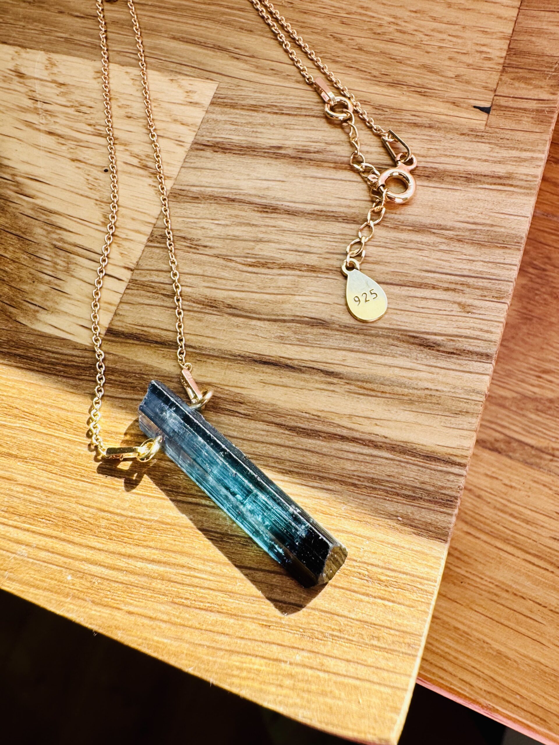 • Kryształ: naturalny, surowy Indygolit – odmiana niebieskiego turmalinu, kryształ szlachetny, bardzo rzadko spotykany, co czyni naszyjnik absolutnie wyjątkowym.