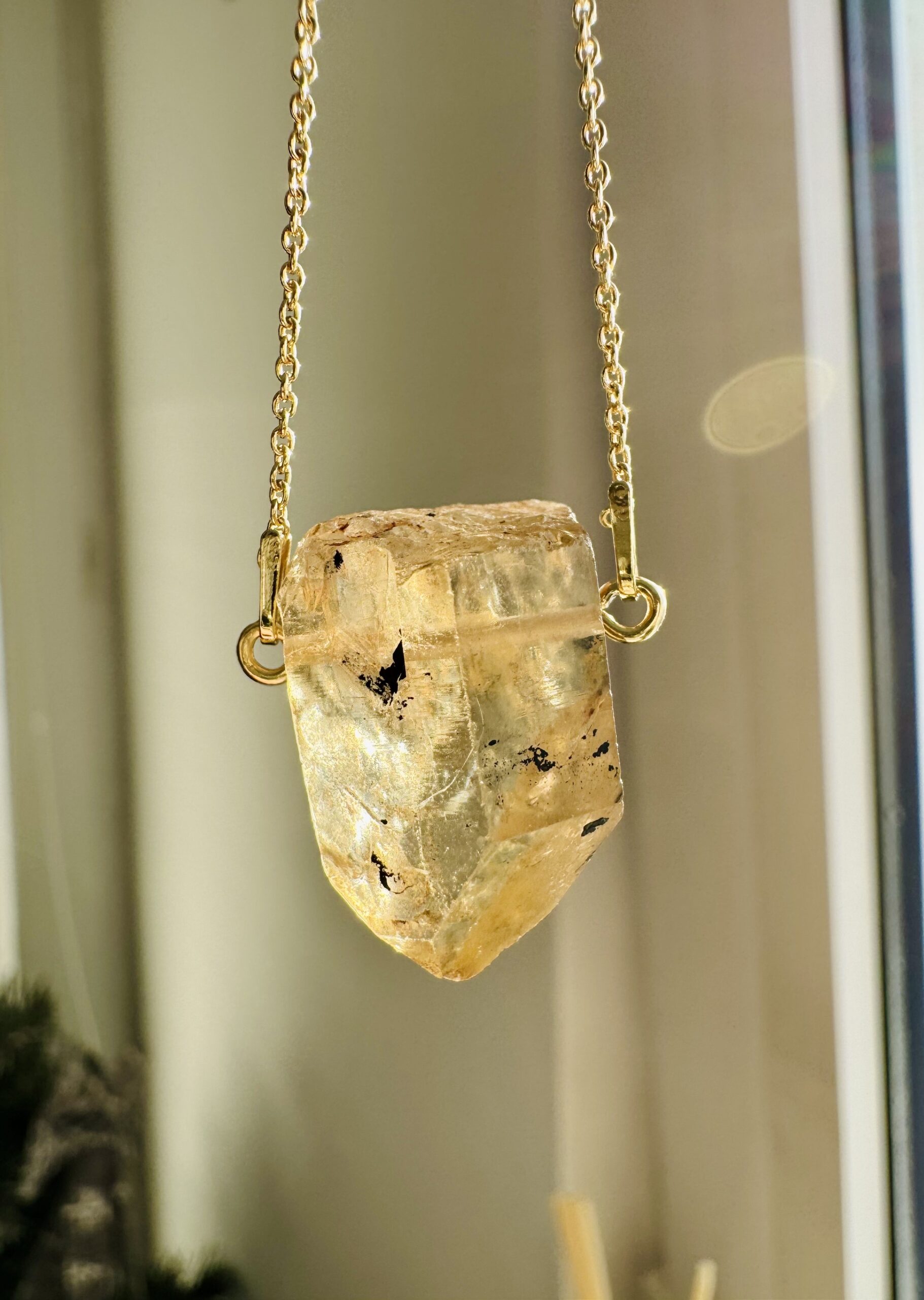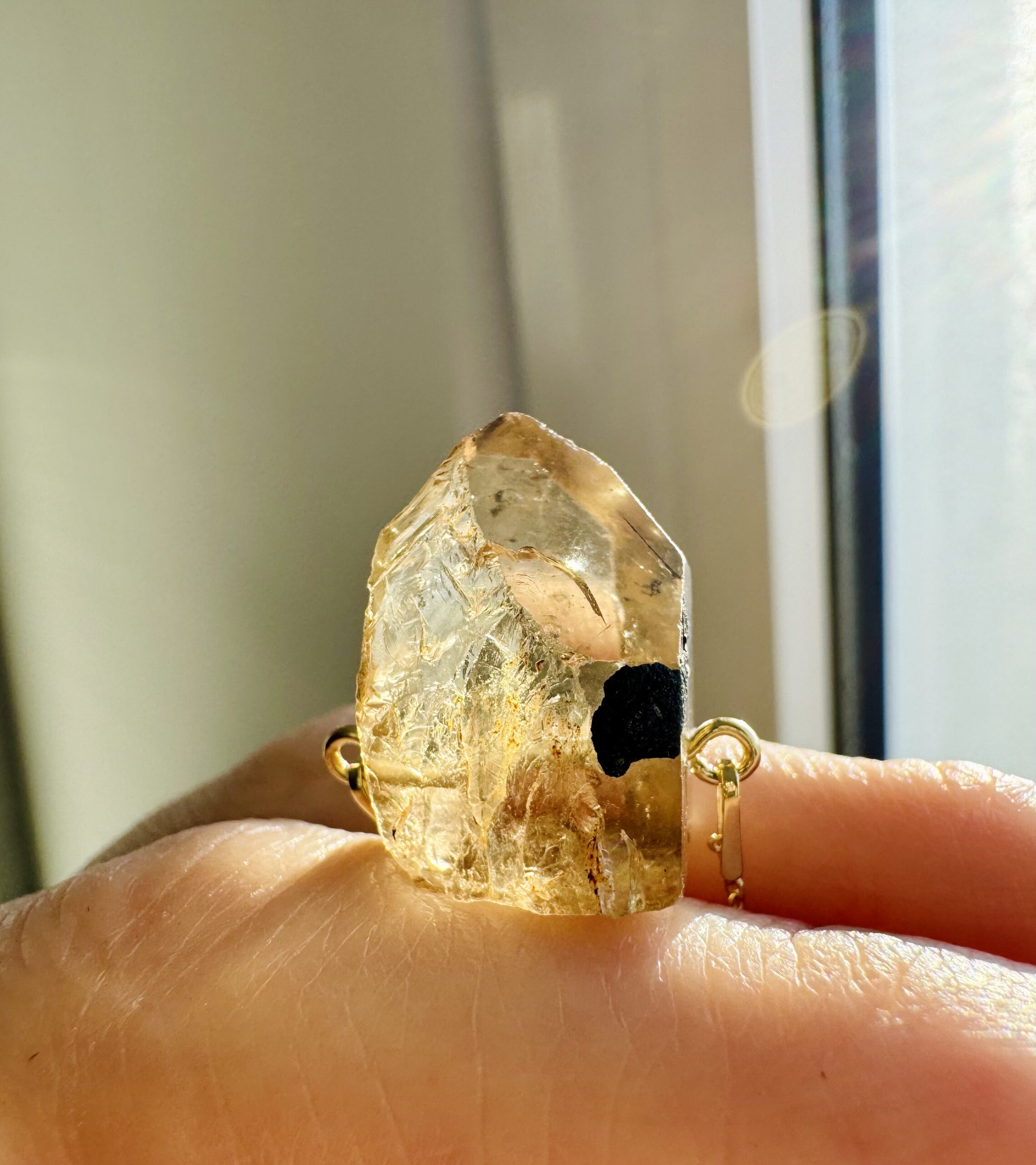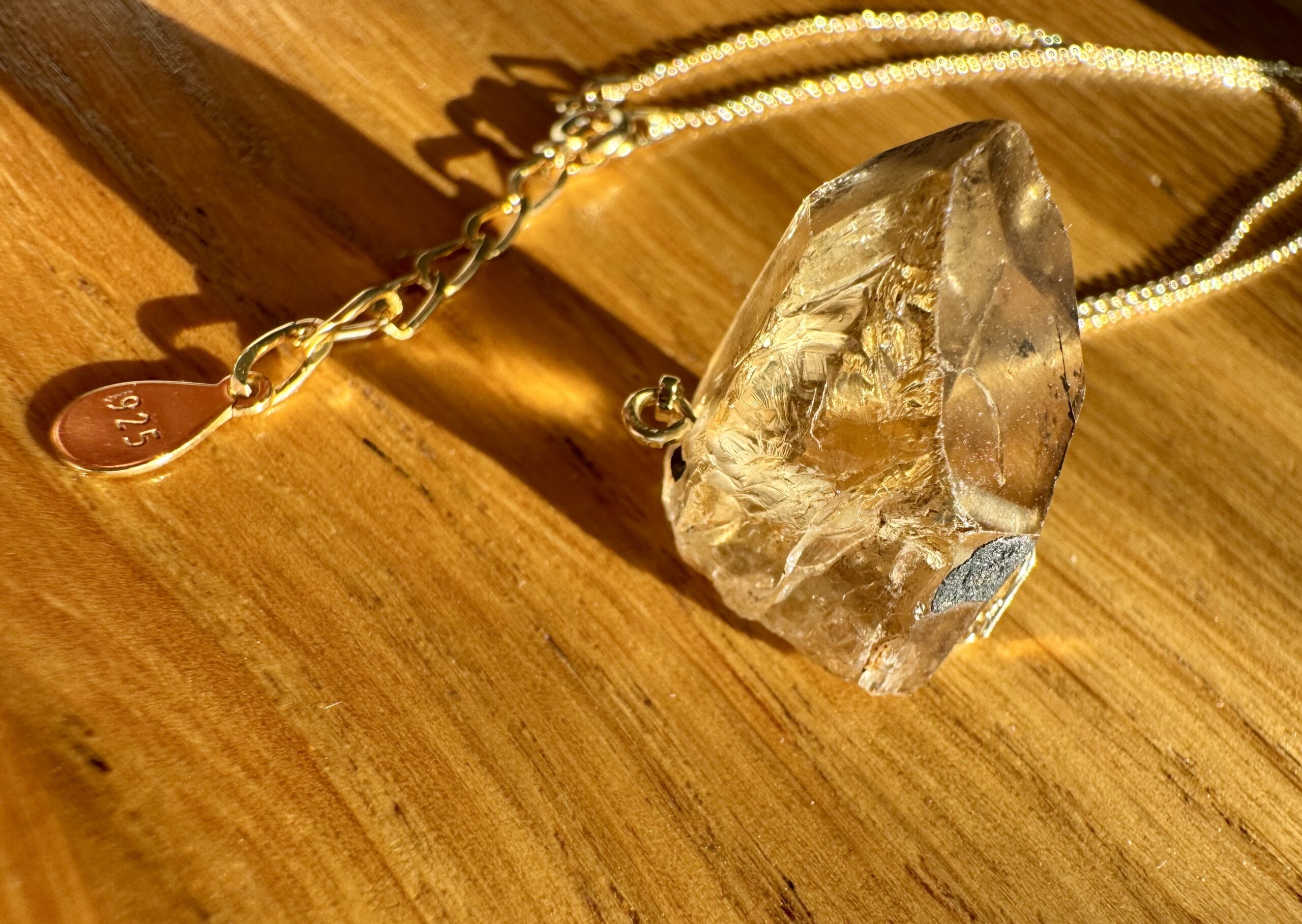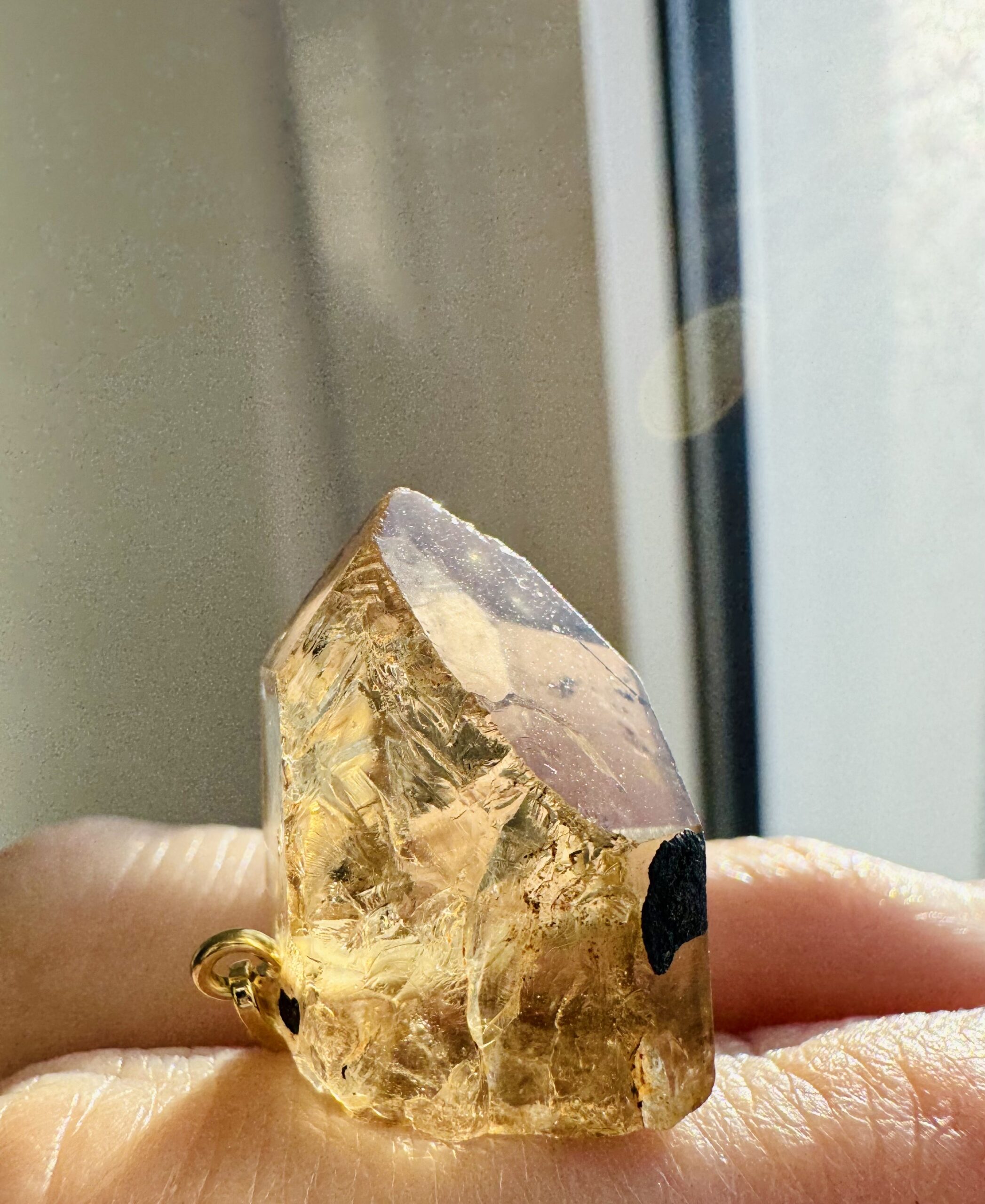 Słońce zamknięte w krysztale. Przedstawiamy nasz nowy urzekający Okaz Cytrynu Naturalnego z Kongo — miejsca, gdzie Ziemia rodzi kryształy o wyjątkowo ciepłym, złocistym blasku. To nie jest grzany ametyst, jak większość kamieni sprzedawanych dziś w sklepach pod nazwą „cytryn”. Ten wyjątkowy Okaz powstał naturalnie, bez jakiejkolwiek obróbki cieplnej. Nie był wypalany, barwiony ani szlifowany — zachował swoją pierwotną strukturę i energię taką, jaką nadała mu natura. Cytryn z Kongo jest rzadki. Ma w sobie światło, które nie zostało stworzone ludzką ręką — ciepło, które nie pochodzi z pieca, lecz z natury. Wyjątkowa czarna inkluzja to naturalny Biotyt — minerał, który powstał razem z Cytrynem w trakcie jego wzrostu. To naturalne zjawisko spotykane w autentycznych kamieniach, dzięki któremu ten egzemplarz jest jedyny w swoim rodzaju.
