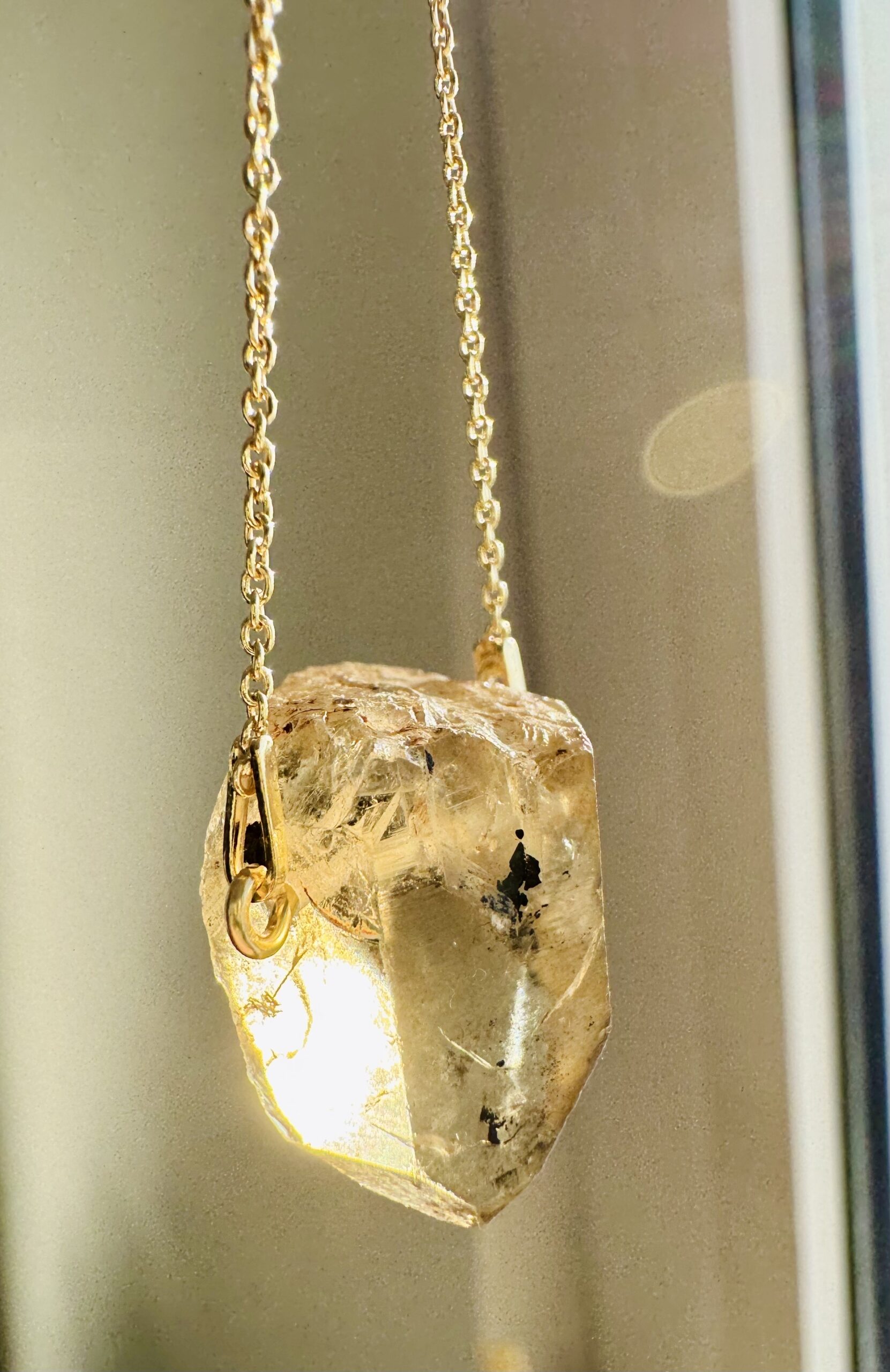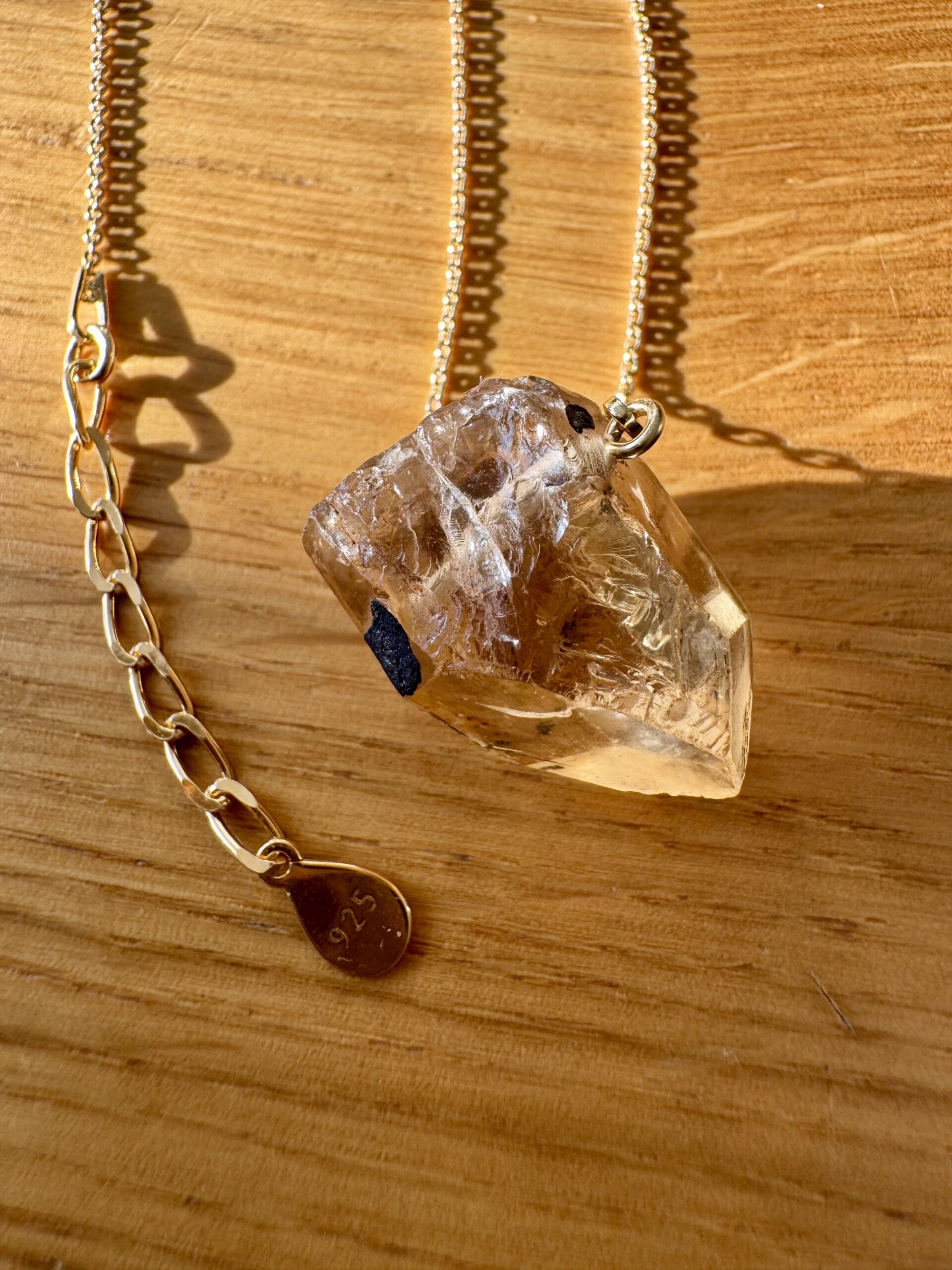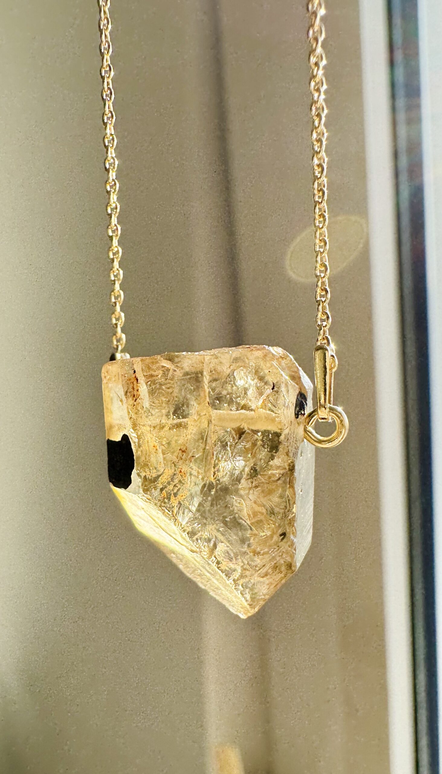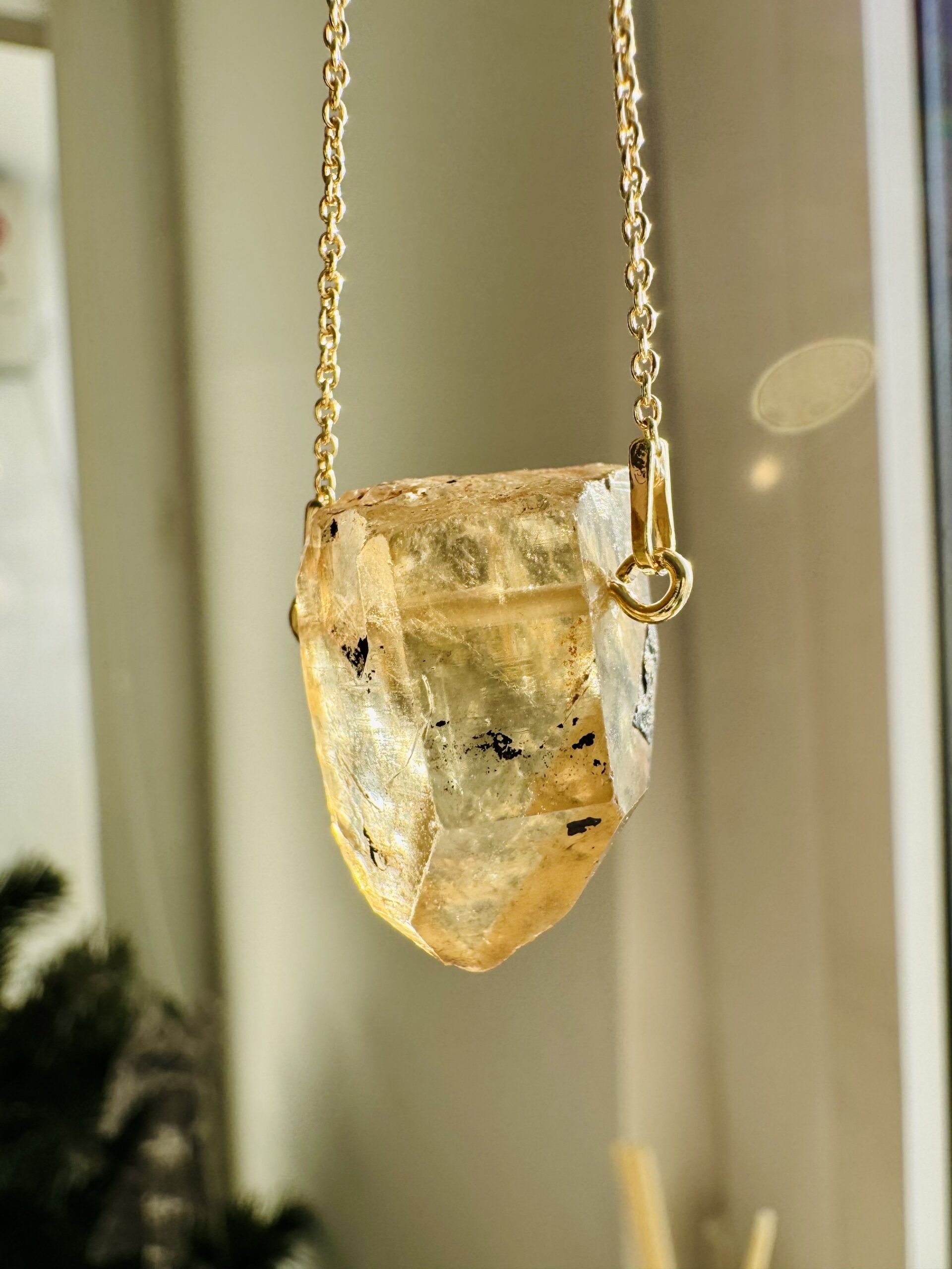 Słońce zamknięte w krysztale. Przedstawiamy nasz nowy urzekający Okaz Cytrynu Naturalnego z Kongo — miejsca, gdzie Ziemia rodzi kryształy o wyjątkowo ciepłym, złocistym blasku. To nie jest grzany ametyst, jak większość kamieni sprzedawanych dziś w sklepach pod nazwą „cytryn”. Ten wyjątkowy Okaz powstał naturalnie, bez jakiejkolwiek obróbki cieplnej. Nie był wypalany, barwiony ani szlifowany — zachował swoją pierwotną strukturę i energię taką, jaką nadała mu natura. Cytryn z Kongo jest rzadki. Ma w sobie światło, które nie zostało stworzone ludzką ręką — ciepło, które nie pochodzi z pieca, lecz z natury. Wyjątkowa czarna inkluzja to naturalny Biotyt — minerał, który powstał razem z Cytrynem w trakcie jego wzrostu. To naturalne zjawisko spotykane w autentycznych kamieniach, dzięki któremu ten egzemplarz jest jedyny w swoim rodzaju.
