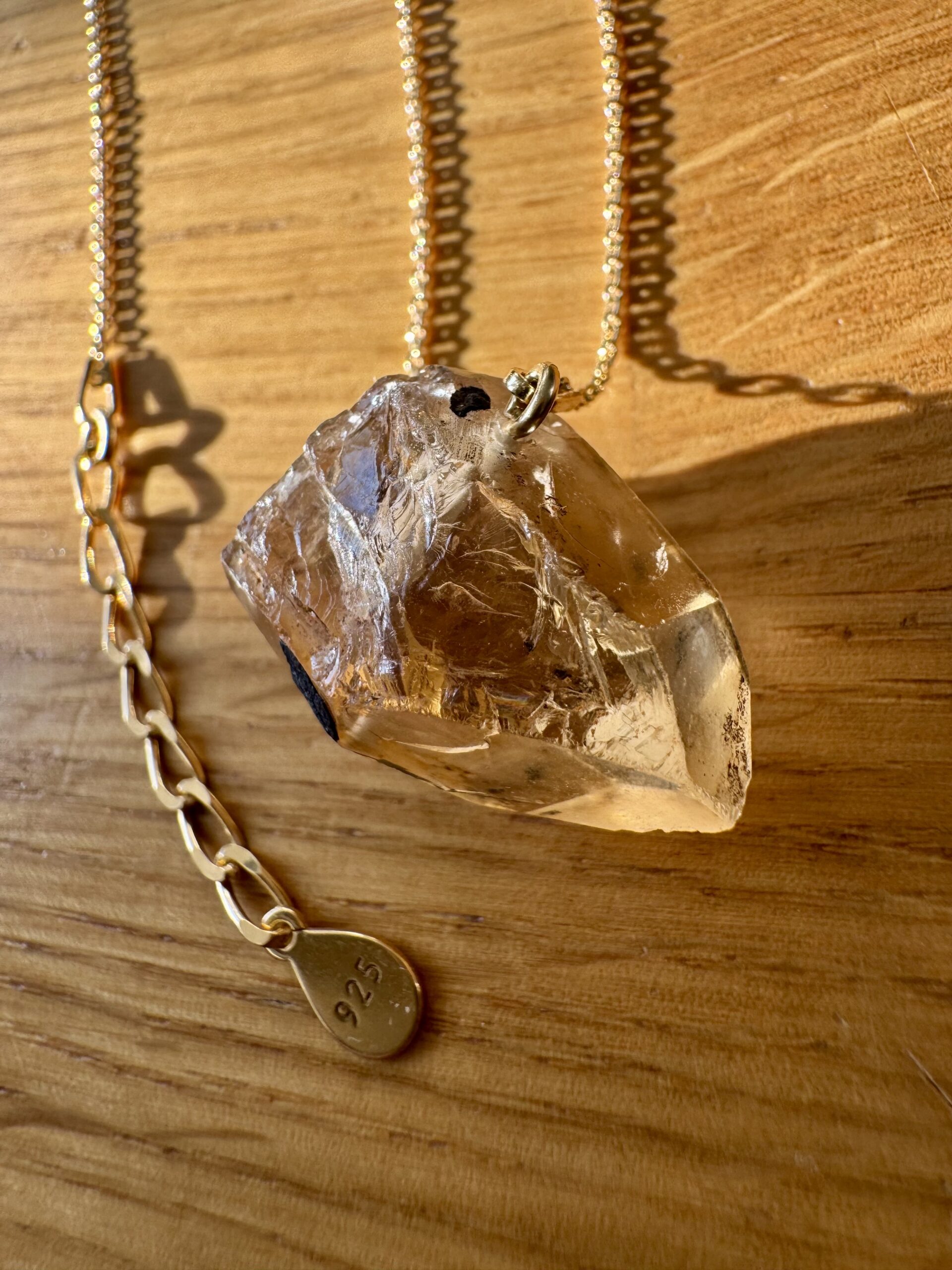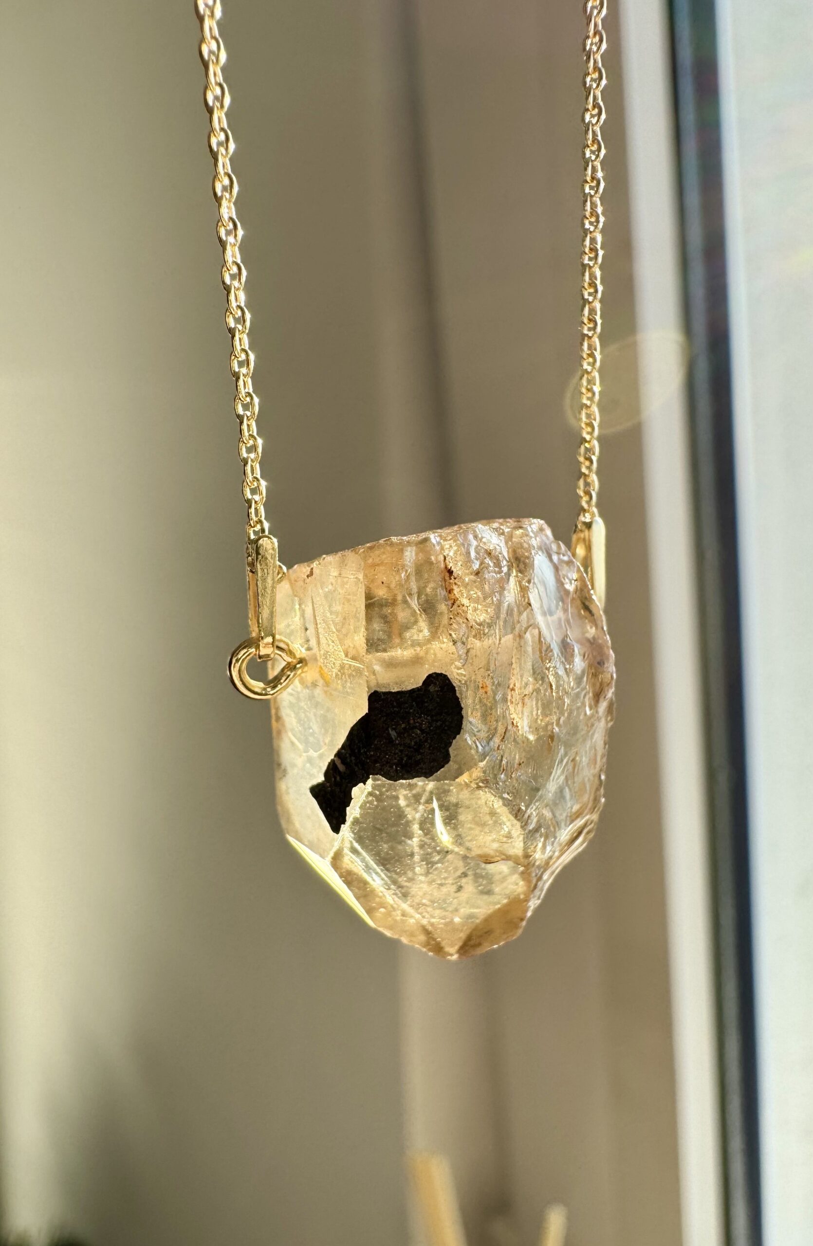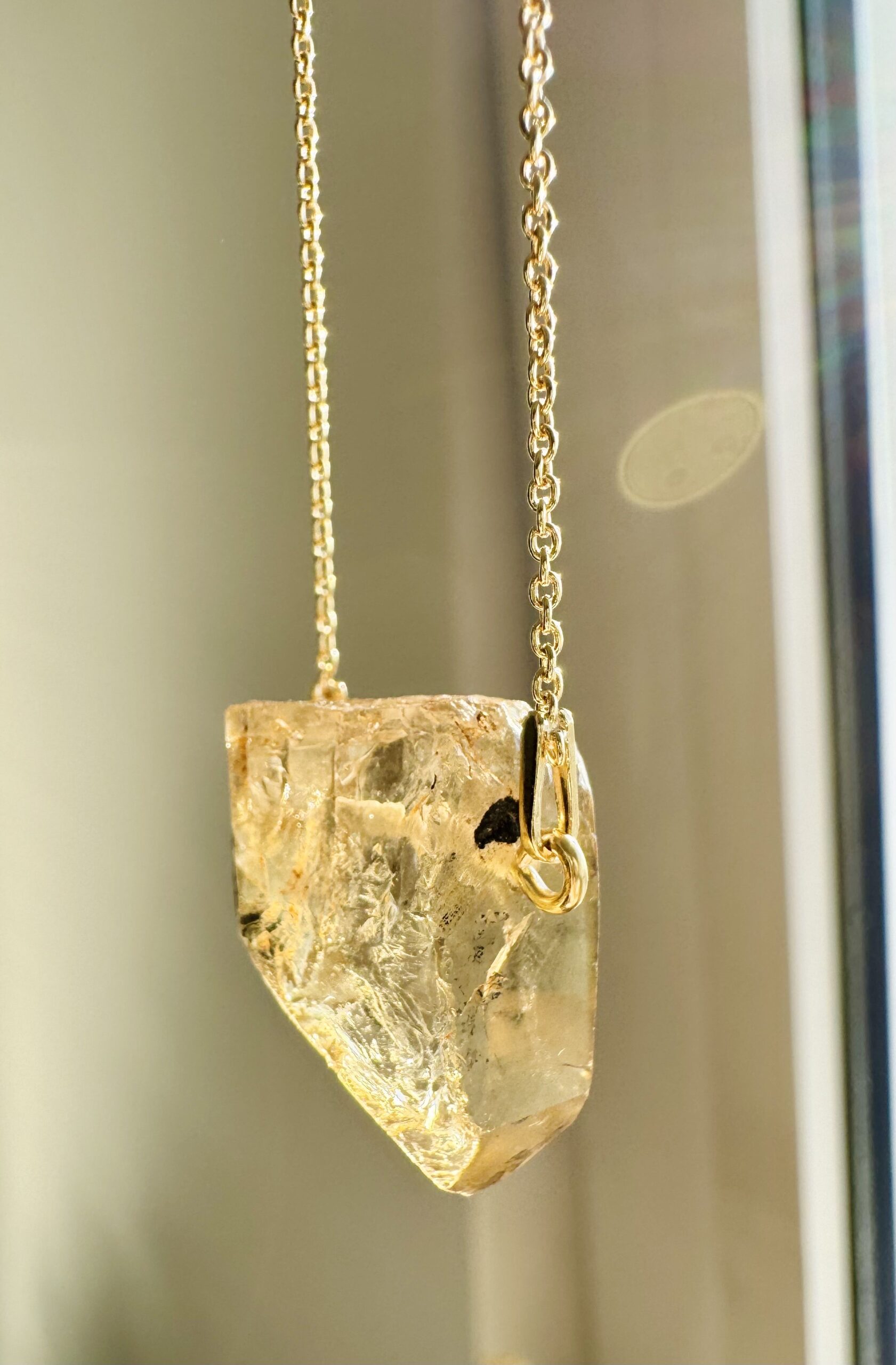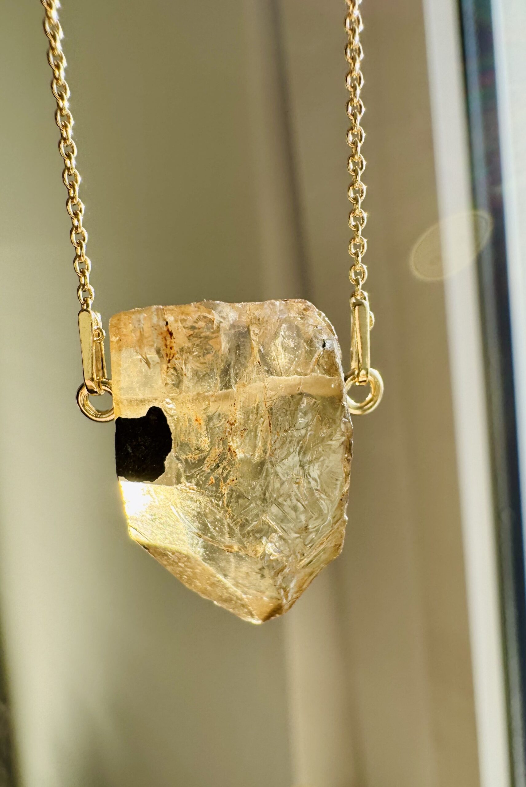 Słońce zamknięte w krysztale. Przedstawiamy nasz nowy urzekający Okaz Cytrynu Naturalnego z Kongo — miejsca, gdzie Ziemia rodzi kryształy o wyjątkowo ciepłym, złocistym blasku. To nie jest grzany ametyst, jak większość kamieni sprzedawanych dziś w sklepach pod nazwą „cytryn”. Ten wyjątkowy Okaz powstał naturalnie, bez jakiejkolwiek obróbki cieplnej. Nie był wypalany, barwiony ani szlifowany — zachował swoją pierwotną strukturę i energię taką, jaką nadała mu natura. Cytryn z Kongo jest rzadki. Ma w sobie światło, które nie zostało stworzone ludzką ręką — ciepło, które nie pochodzi z pieca, lecz z natury. Wyjątkowa czarna inkluzja to naturalny Biotyt — minerał, który powstał razem z Cytrynem w trakcie jego wzrostu. To naturalne zjawisko spotykane w autentycznych kamieniach, dzięki któremu ten egzemplarz jest jedyny w swoim rodzaju.