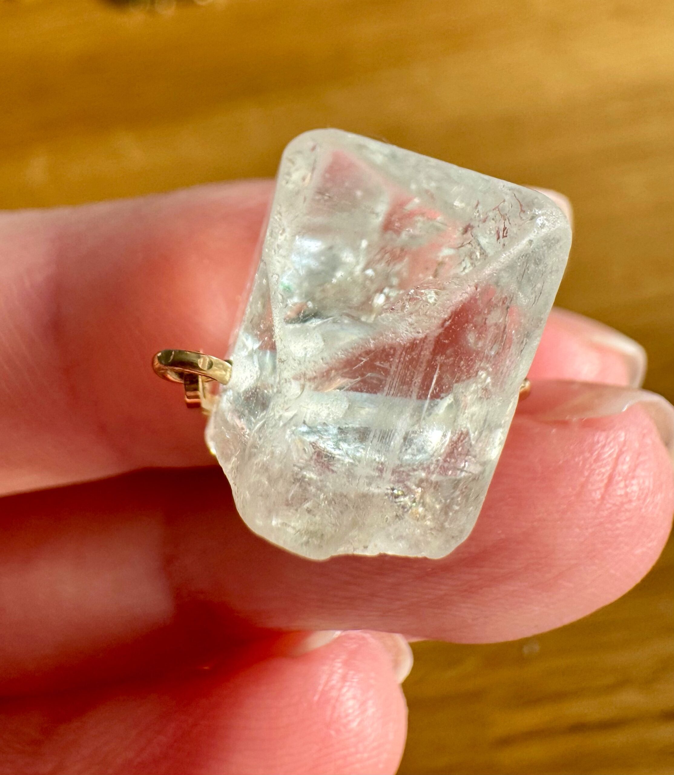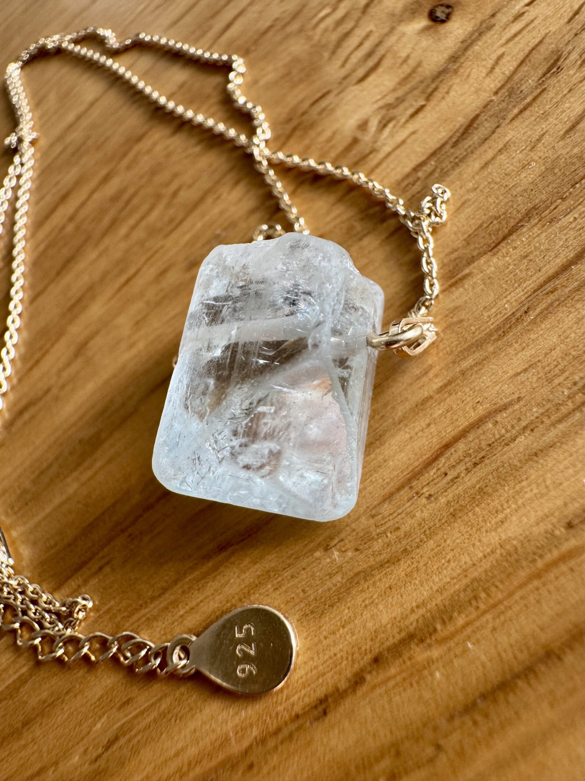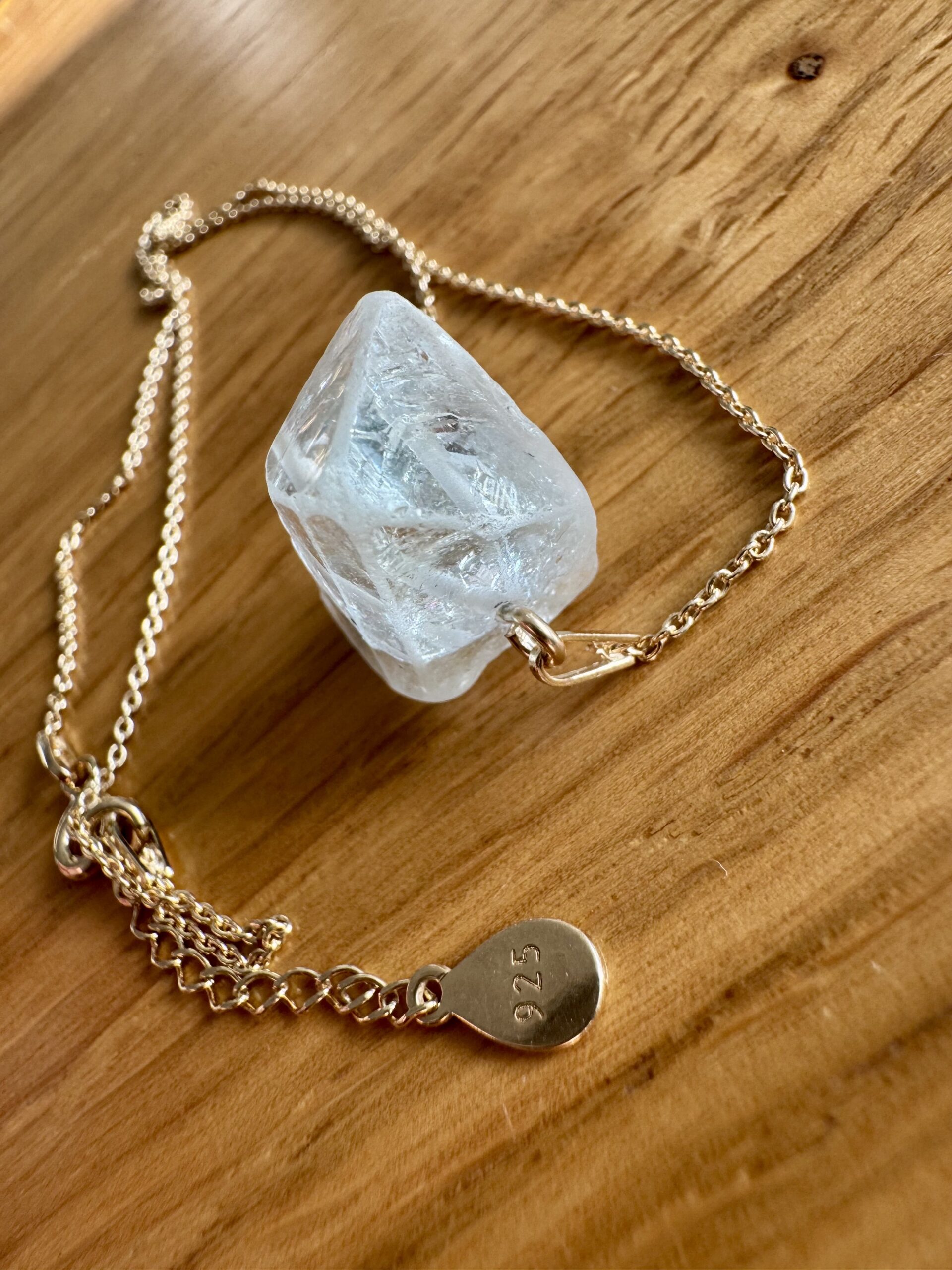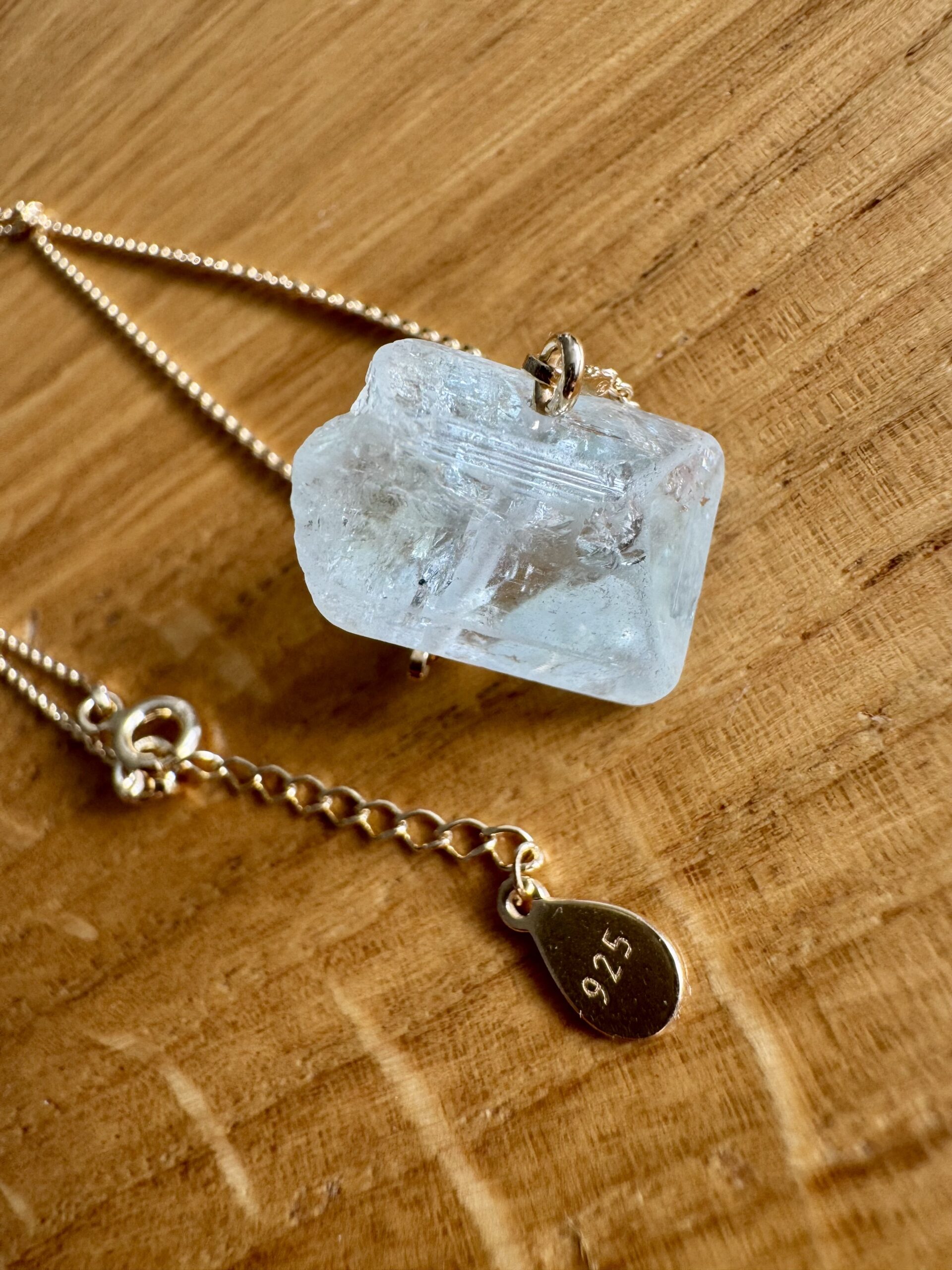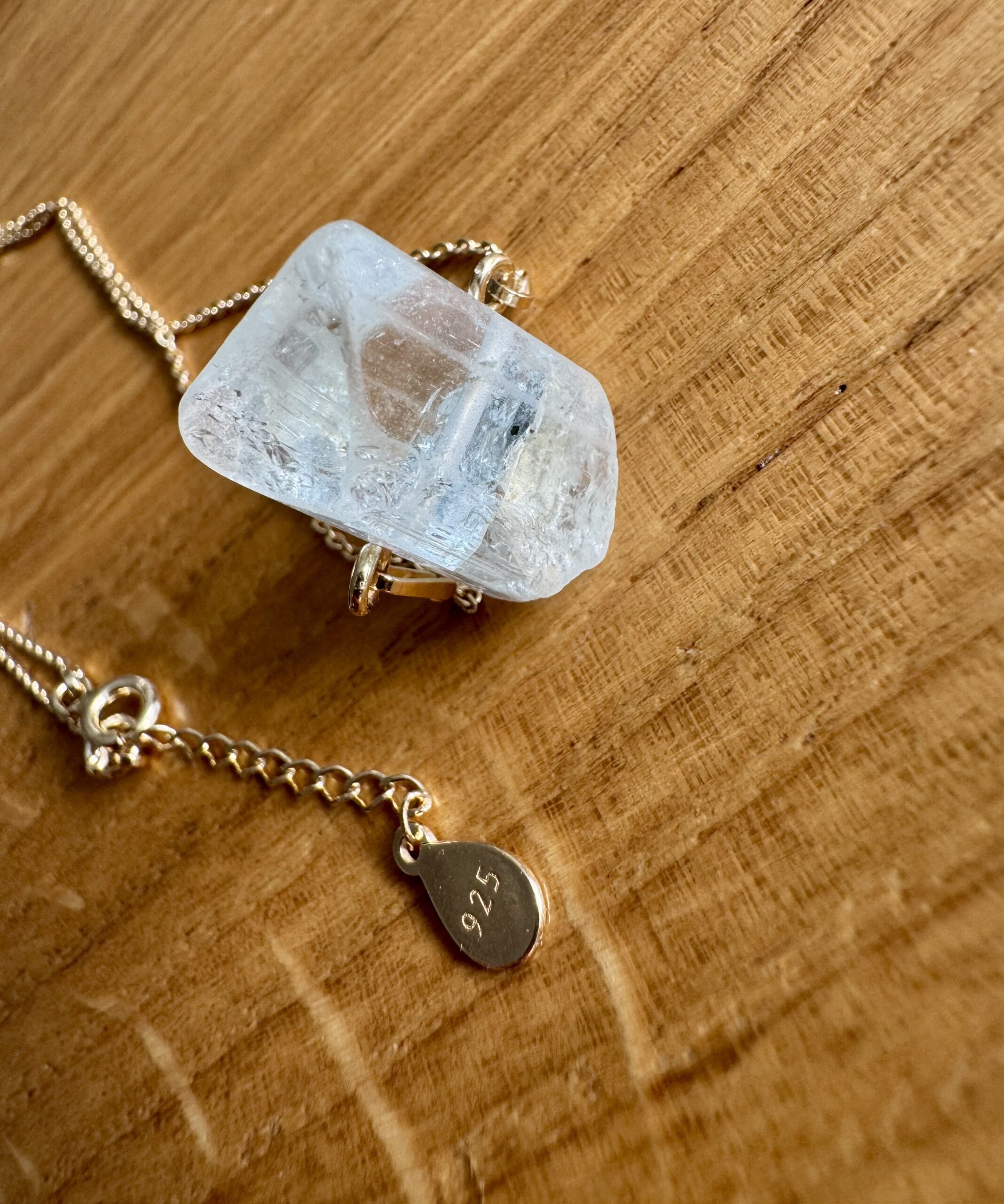 Topaz Aqua Blue z Nigerii — jak kostka lodu, która zatrzymała oddech zimy ❄️ Naturalny, nieszlifowany kryształ oprawiony w srebro grubozłocone 18-karatowym złotem (próba 750). Topaz niebieski jest bardzo rzadko spotykany w surowej, krystalicznej, nieszlifowanej formie. ✨Jego energia przynosi spokój i klarowność — jak chłodne powietrze o poranku, gdy wszystko staje się wyraźne. Pomaga oczyścić myśli, uspokoić emocje i dostrzec to, co naprawdę ważne. Dla tych, którzy szukają światła w ciszy i blasku w prostocie.