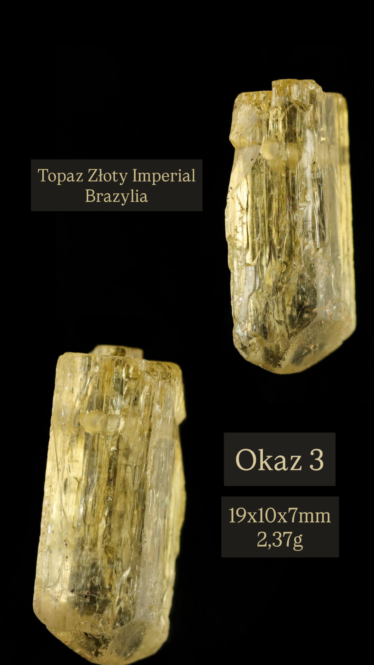 Naturalne, nieobrobione barwiąco topazy z kopalń Capão i Vermelhão w rejonach Dom Bosco i Rodrigo Silva. Przezroczyste, „eye-clean”, bez potrzeby dodatkowych zabiegów.