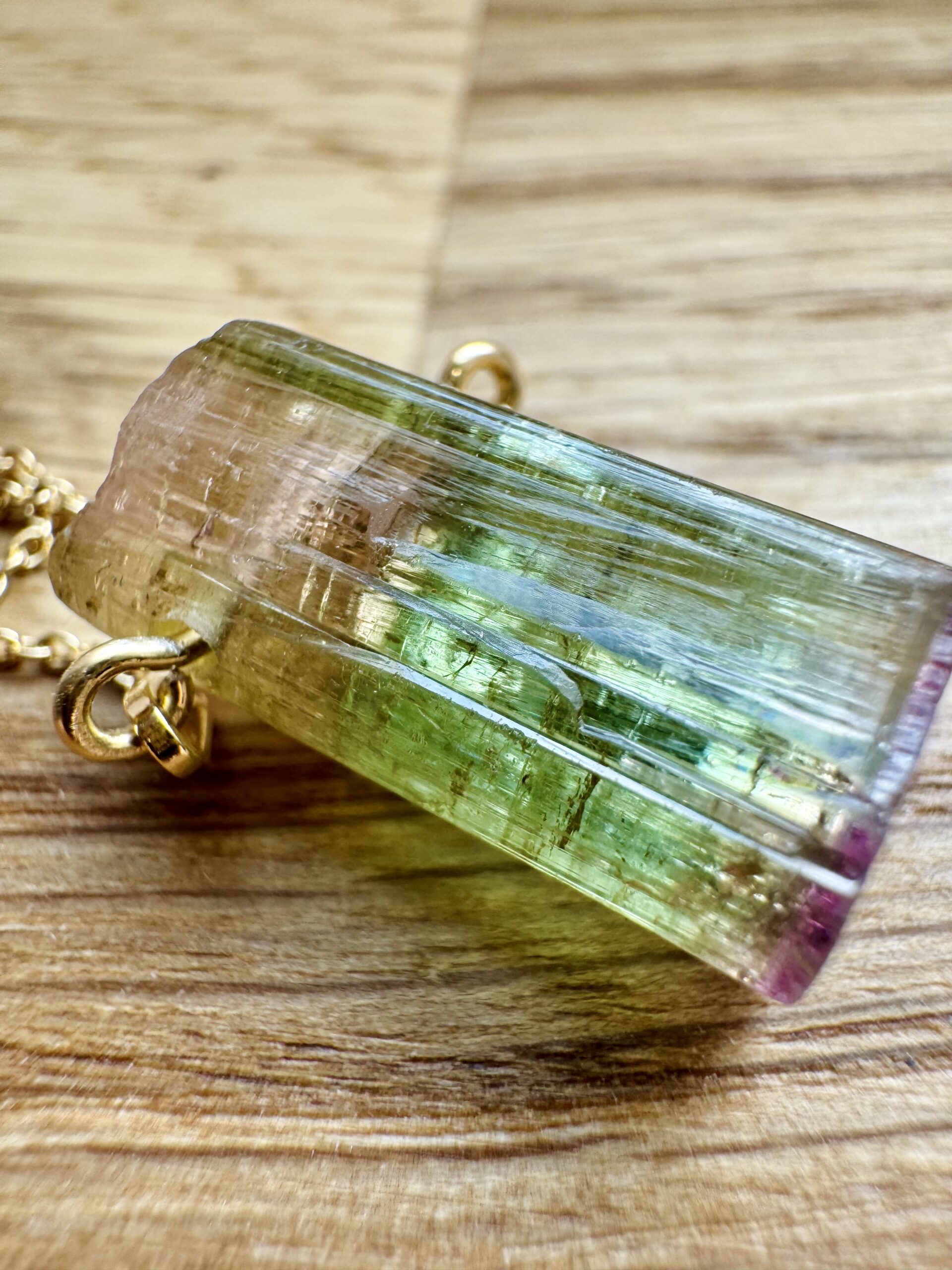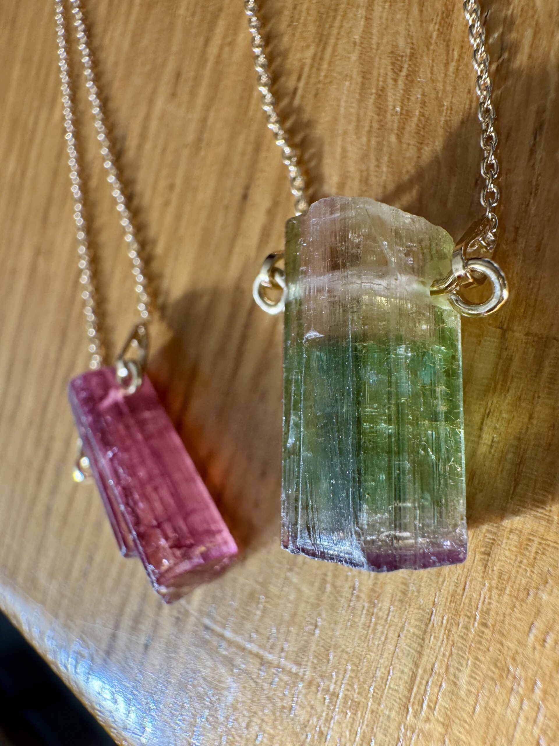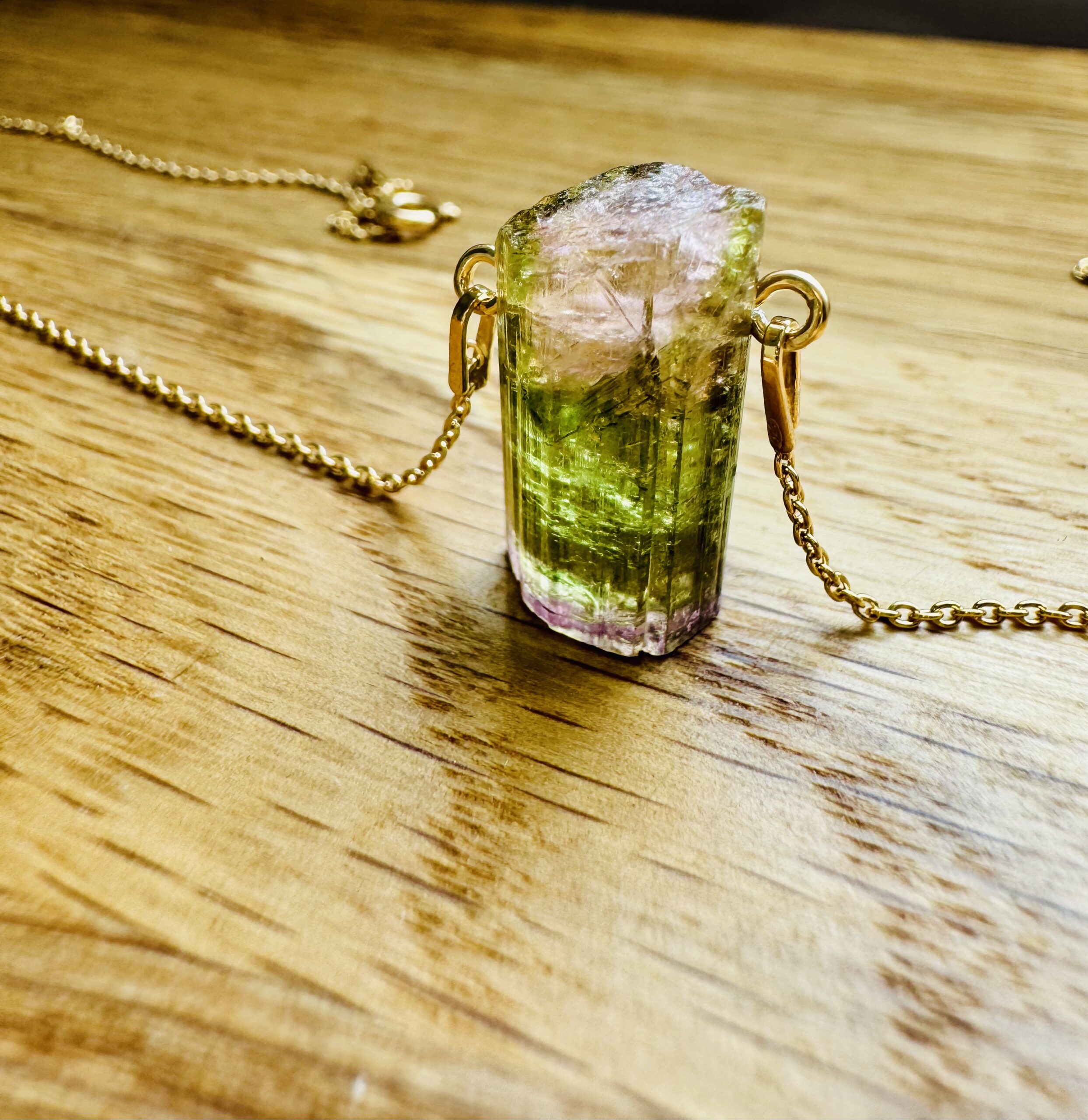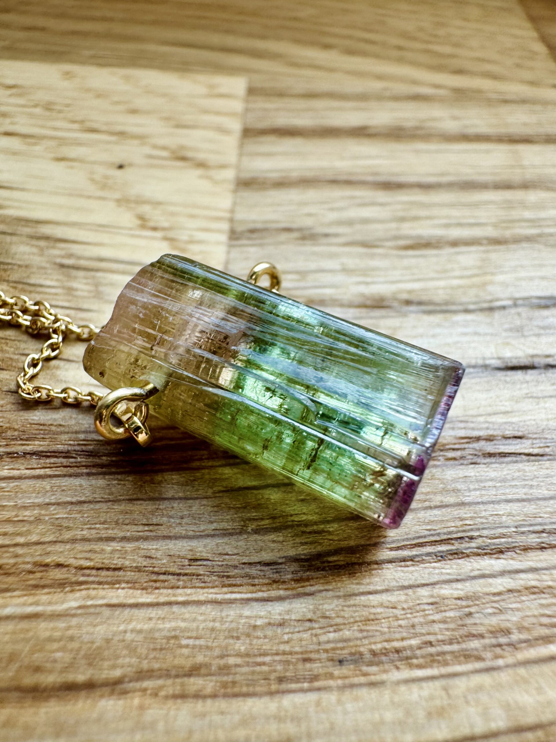 turmalin watermelon, naturalny turmalin , trójstrefowy turmalin, naszyjnik z turmalinem, kamienie kolekcjonerskie, biżuteria z kamieni naturalnych, turmalin kolekcjonerski, ekskluzywny turmalin, turmalin gradient kolorów, srebrny naszyjnik ze złoceniem 750