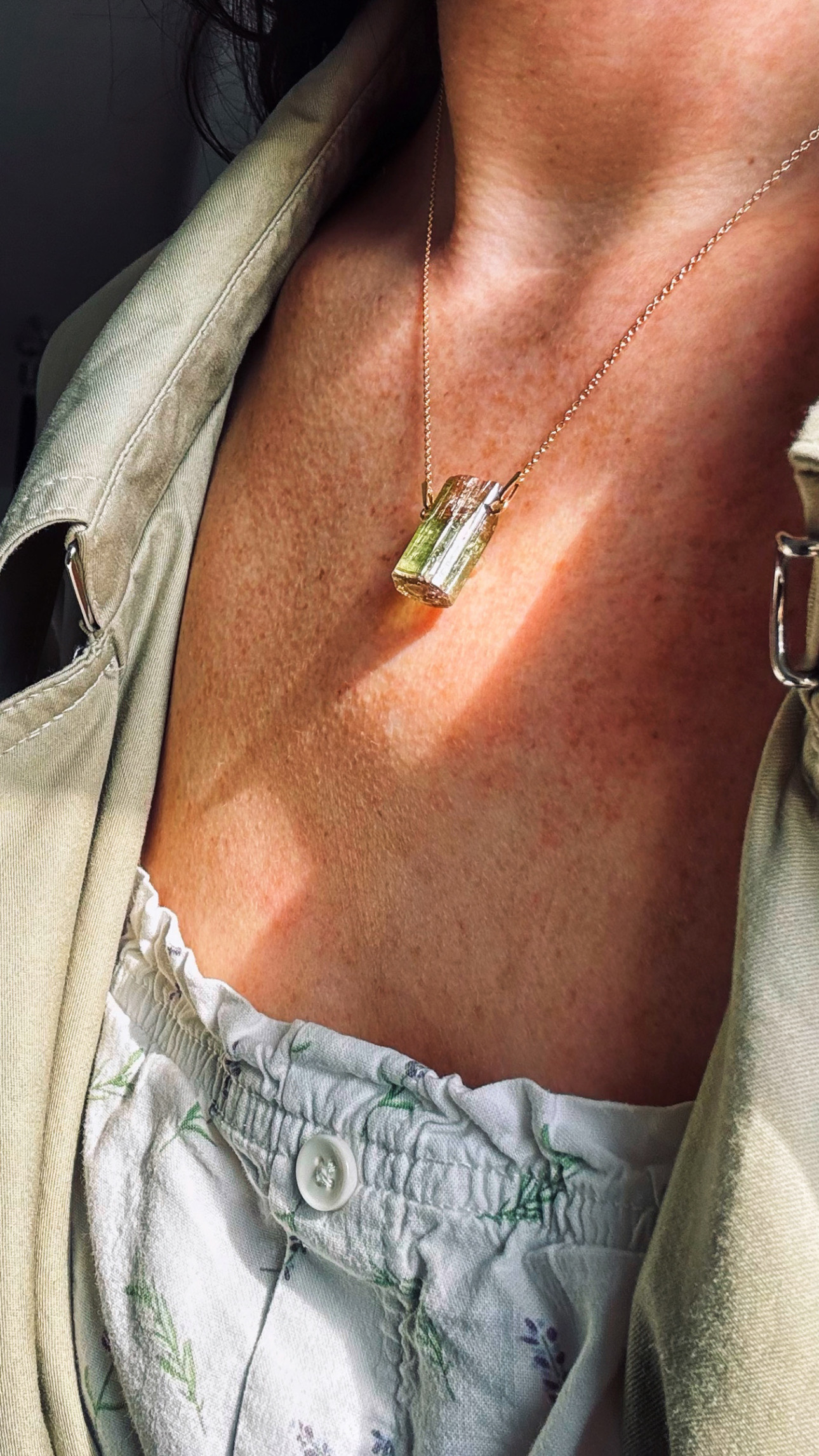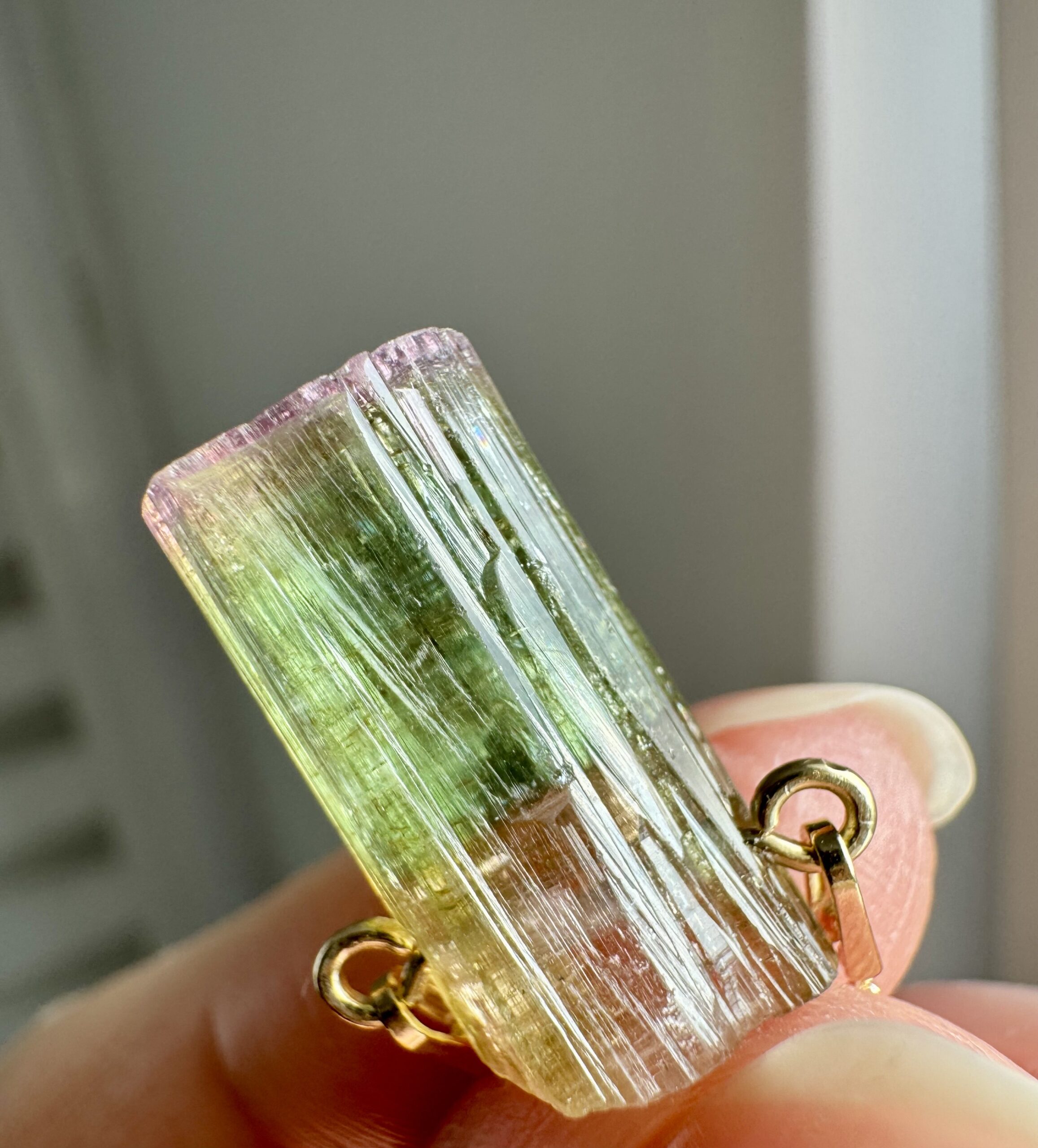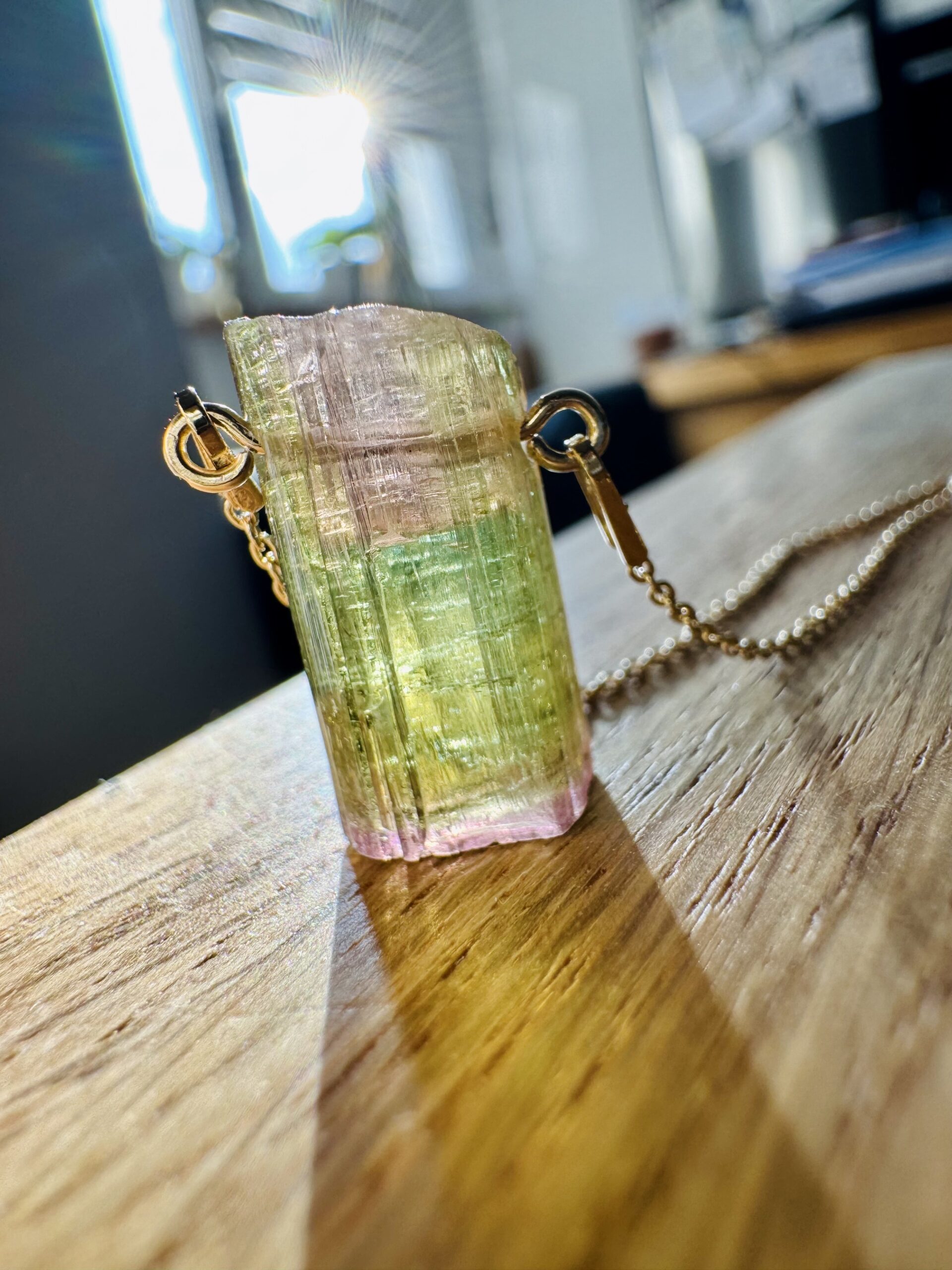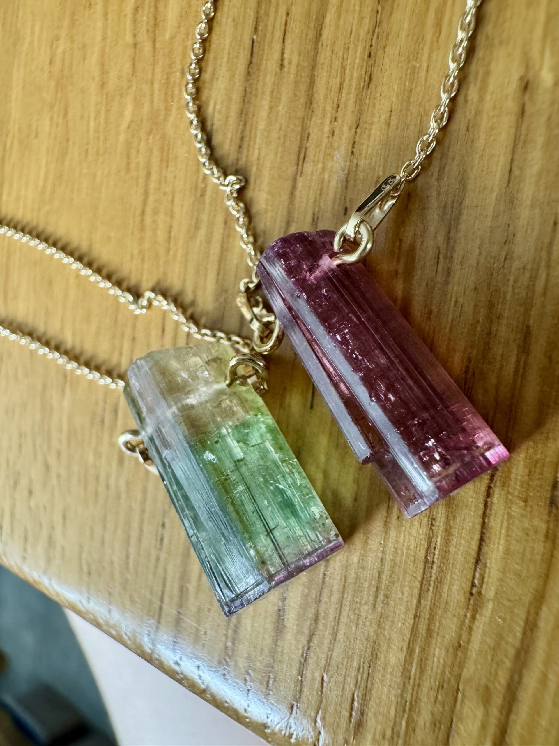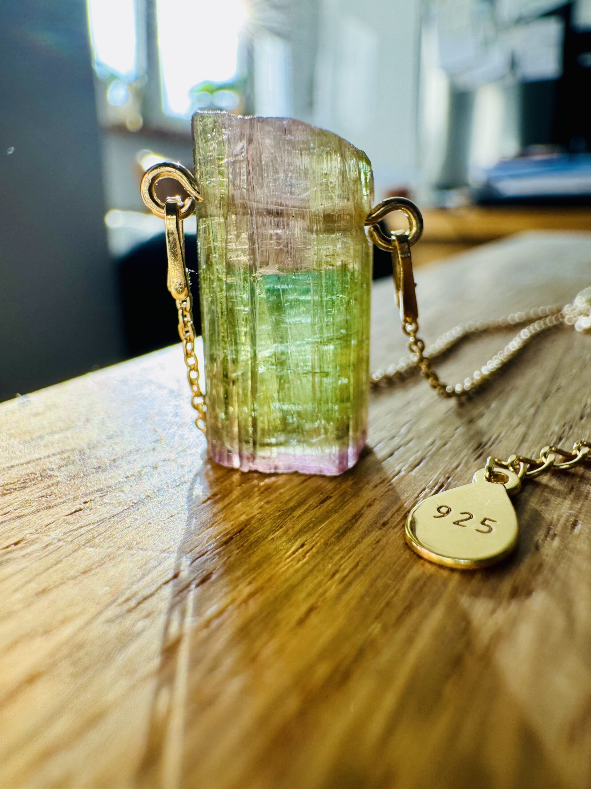 turmalin watermelon, naturalny turmalin , trójstrefowy turmalin, naszyjnik z turmalinem, kamienie kolekcjonerskie, biżuteria z kamieni naturalnych, turmalin kolekcjonerski, ekskluzywny turmalin, turmalin gradient kolorów, srebrny naszyjnik ze złoceniem 750