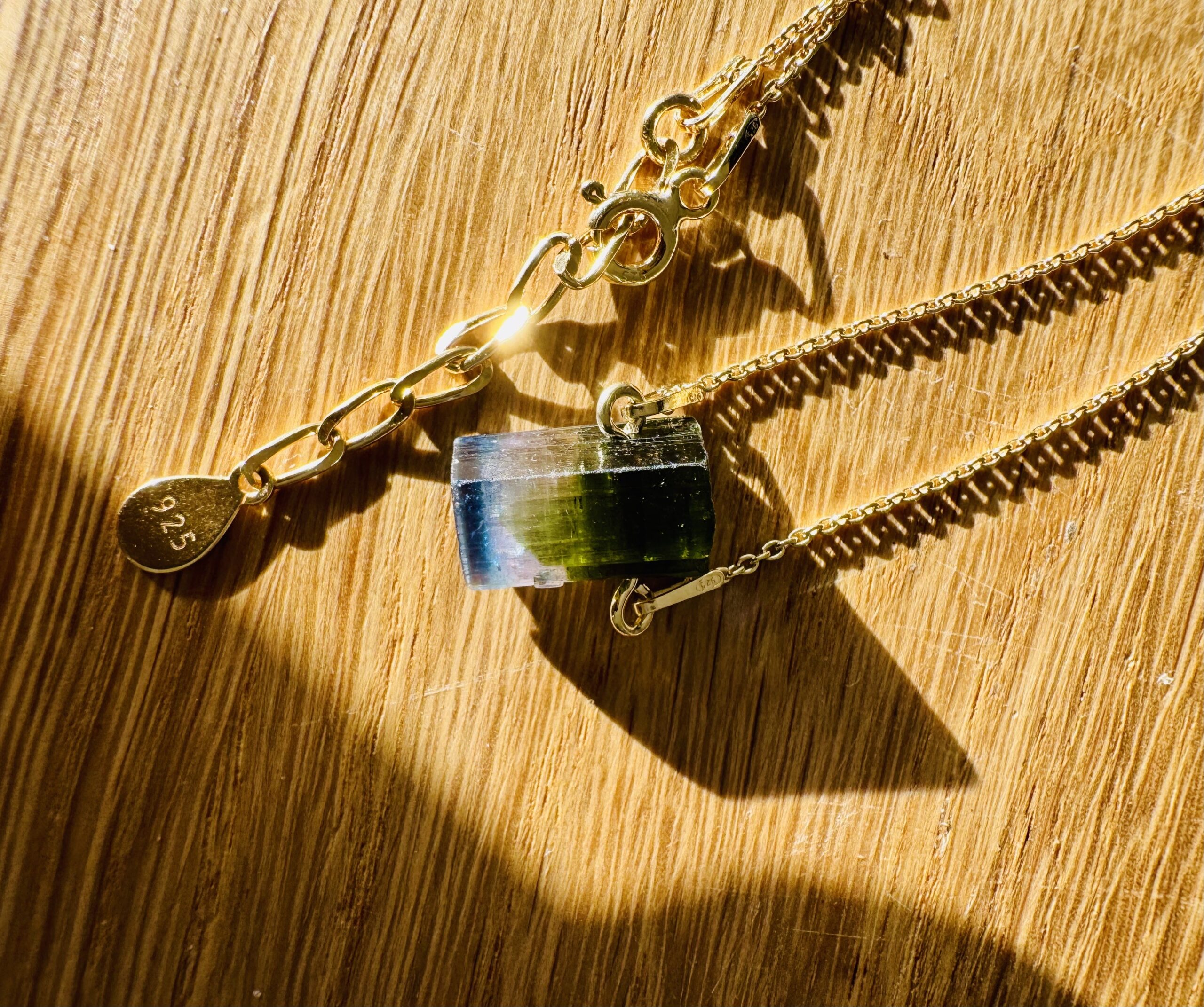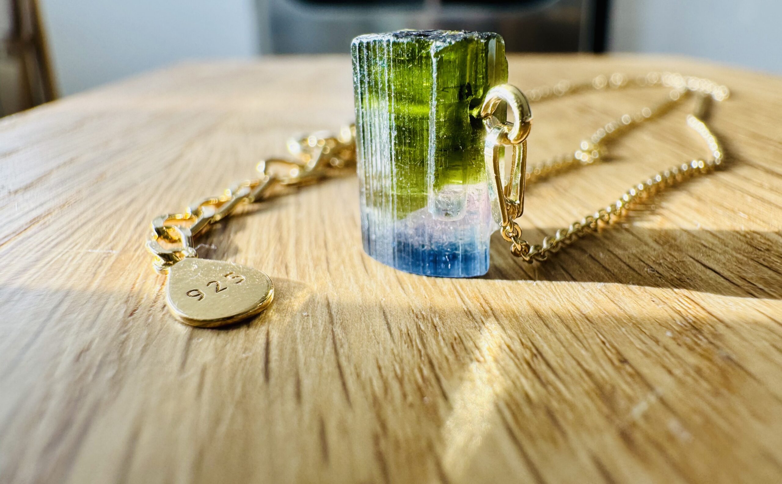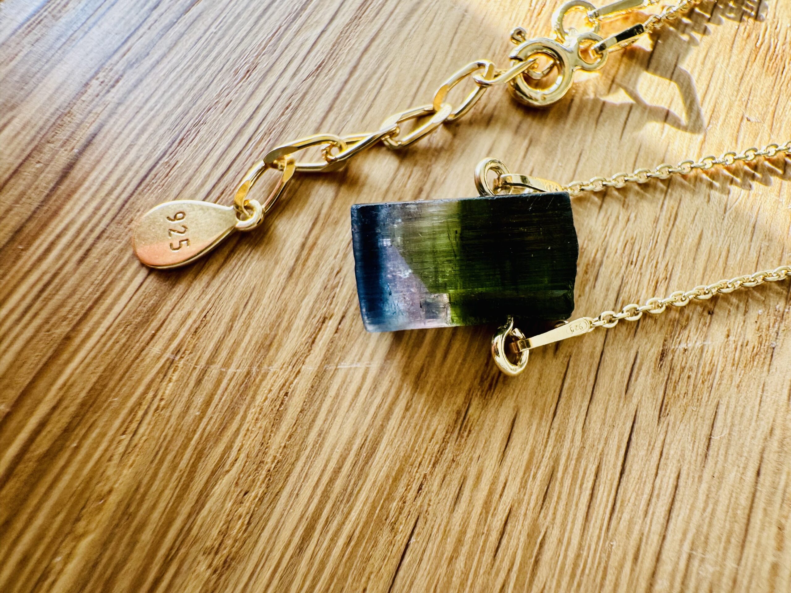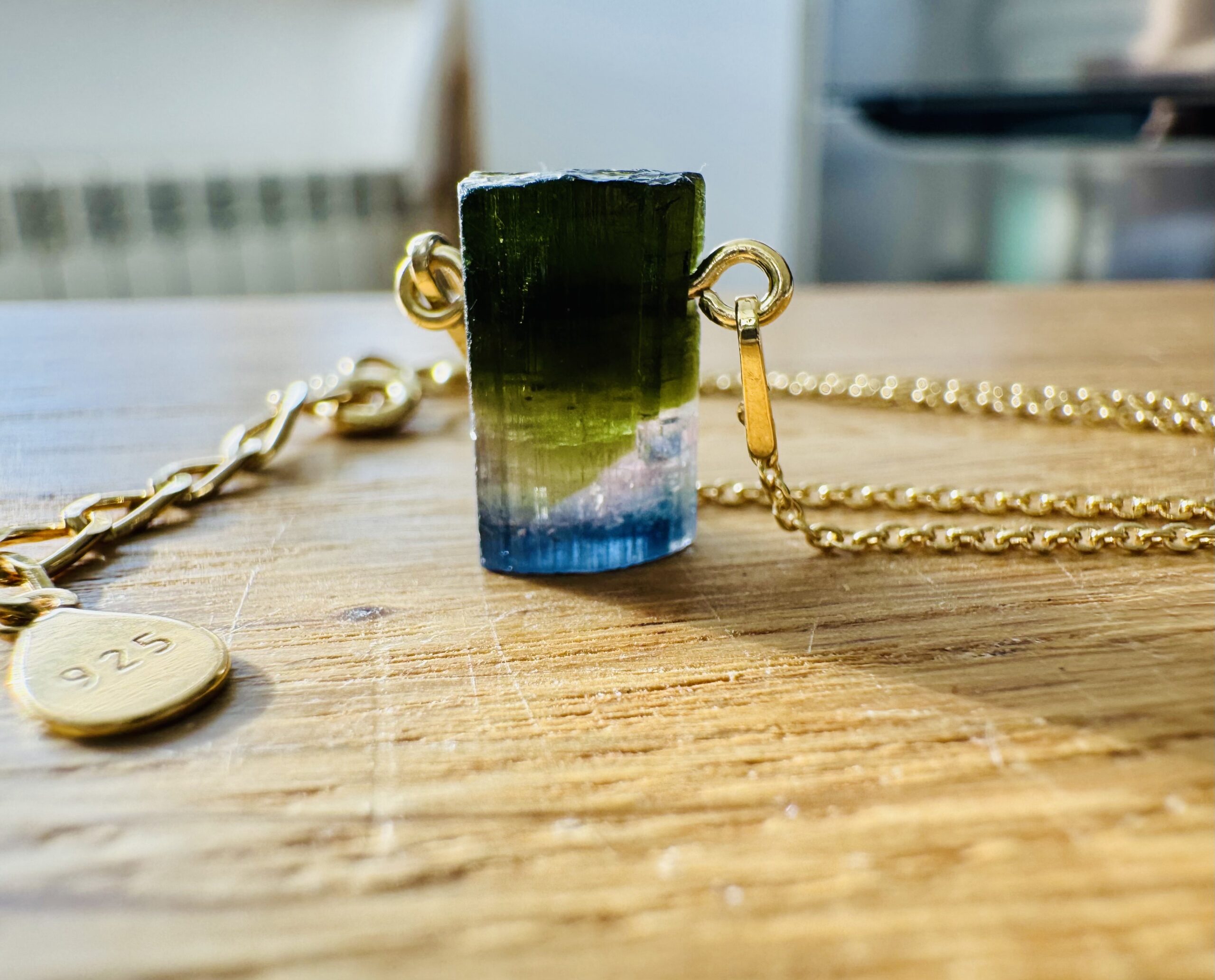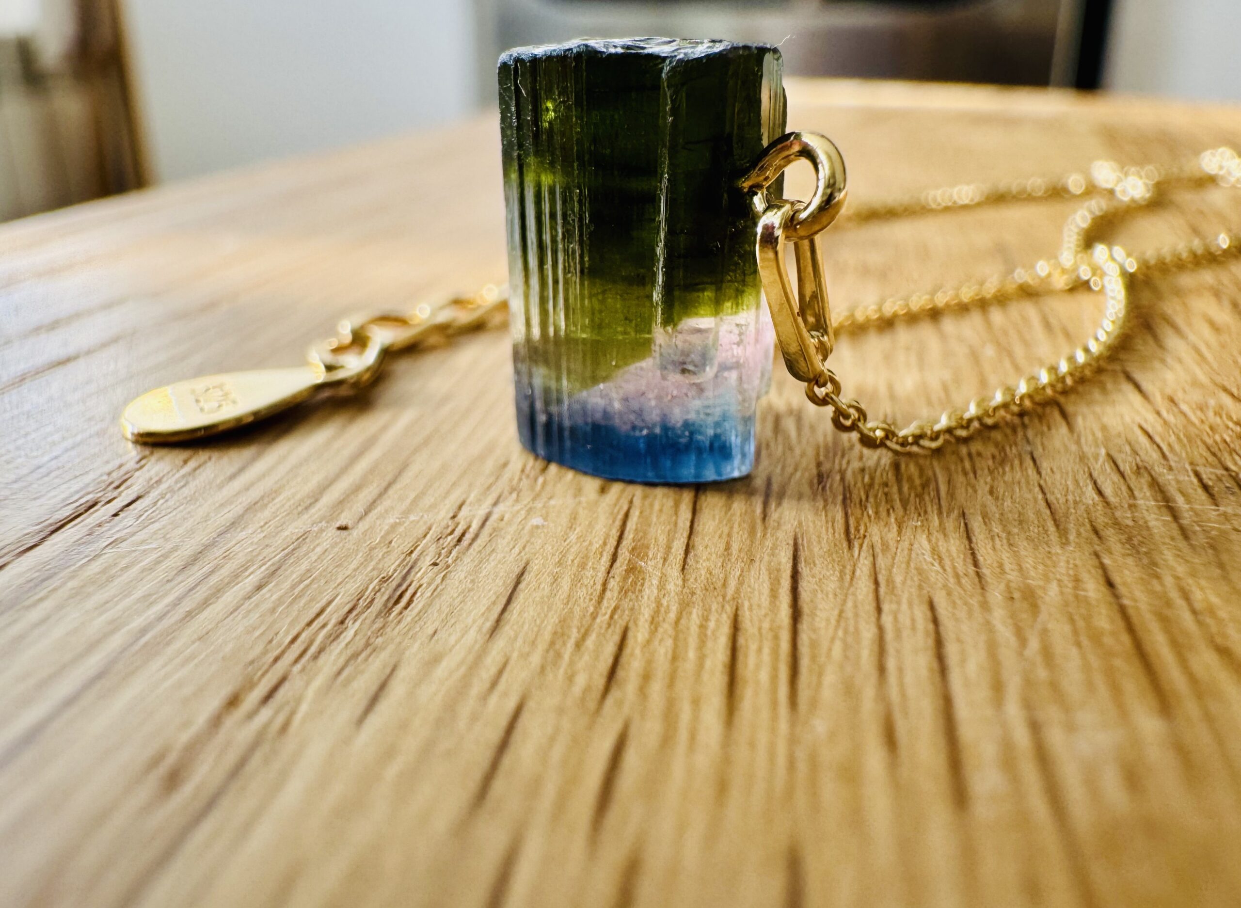 Naszyjnik Blue Cap Tourmaline – luksusowa biżuteria z naturalnym kryształem. Poznaj elegancję i rzadkość w najczystszej formie: surowy, naturalny kryształ Blue Cap Tourmaline, osadzony w starannie wykonanej oprawie ze srebra i 18K złota próby 750. To wyjątkowy, kolekcjonerski Okaz z naszej kolekcji Premium – limitowany, niepowtarzalny. Doskonały dla osób, które cenią naturalne kryształy, luksus i ręczną pracę.