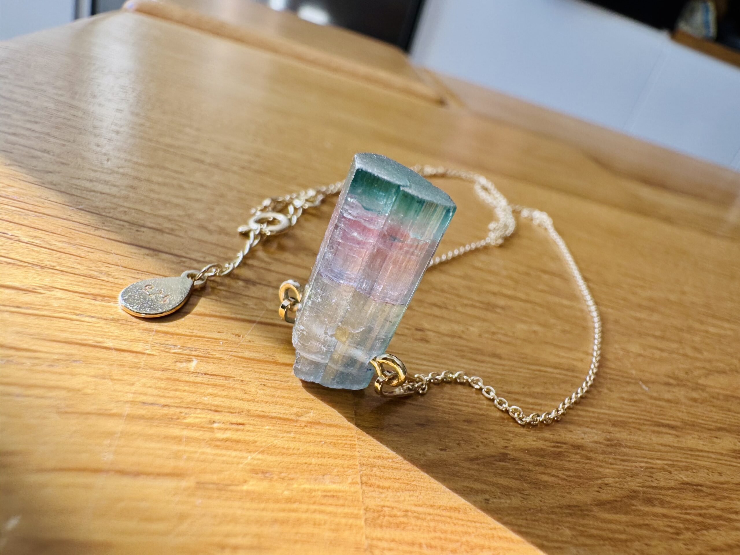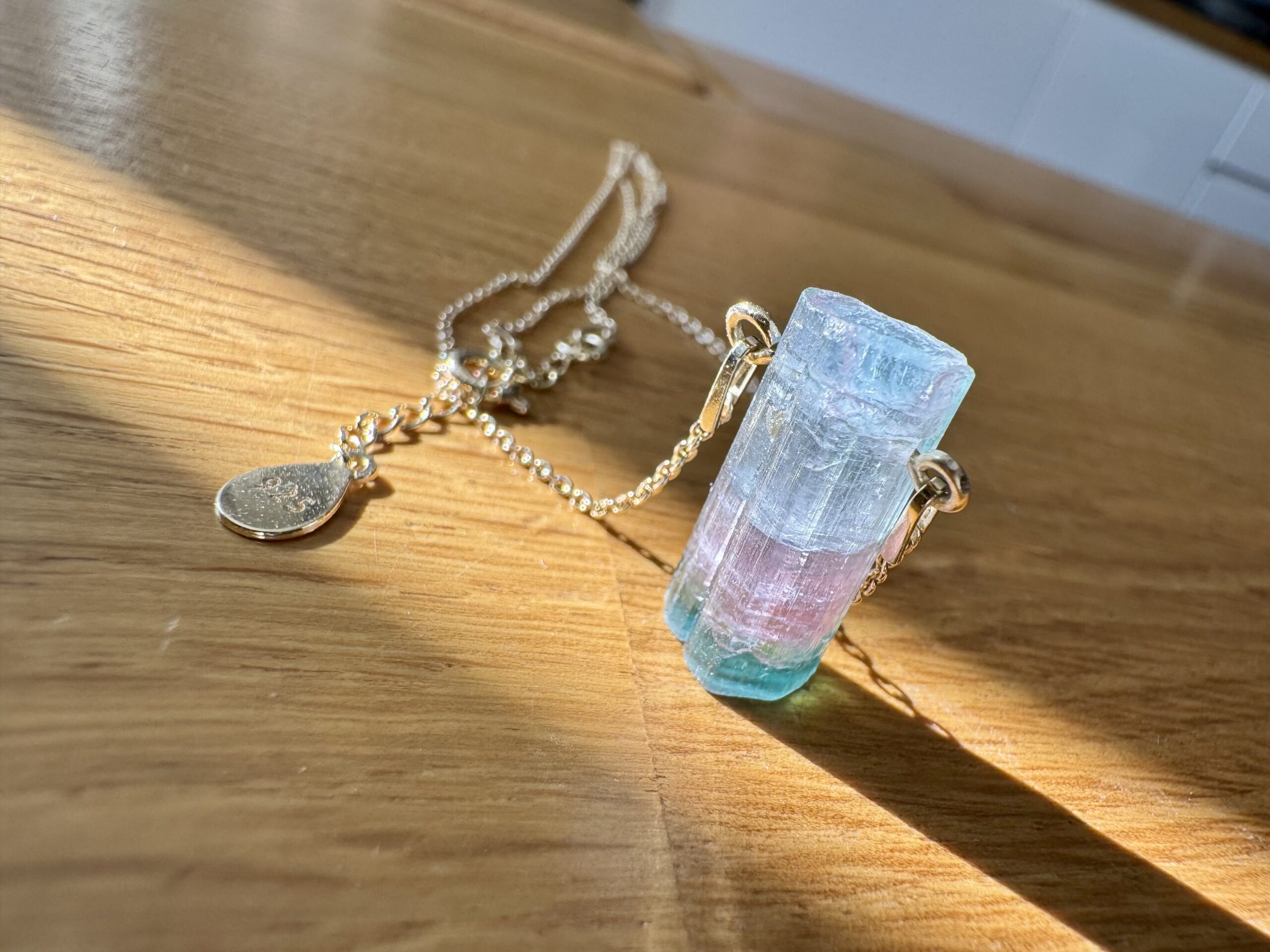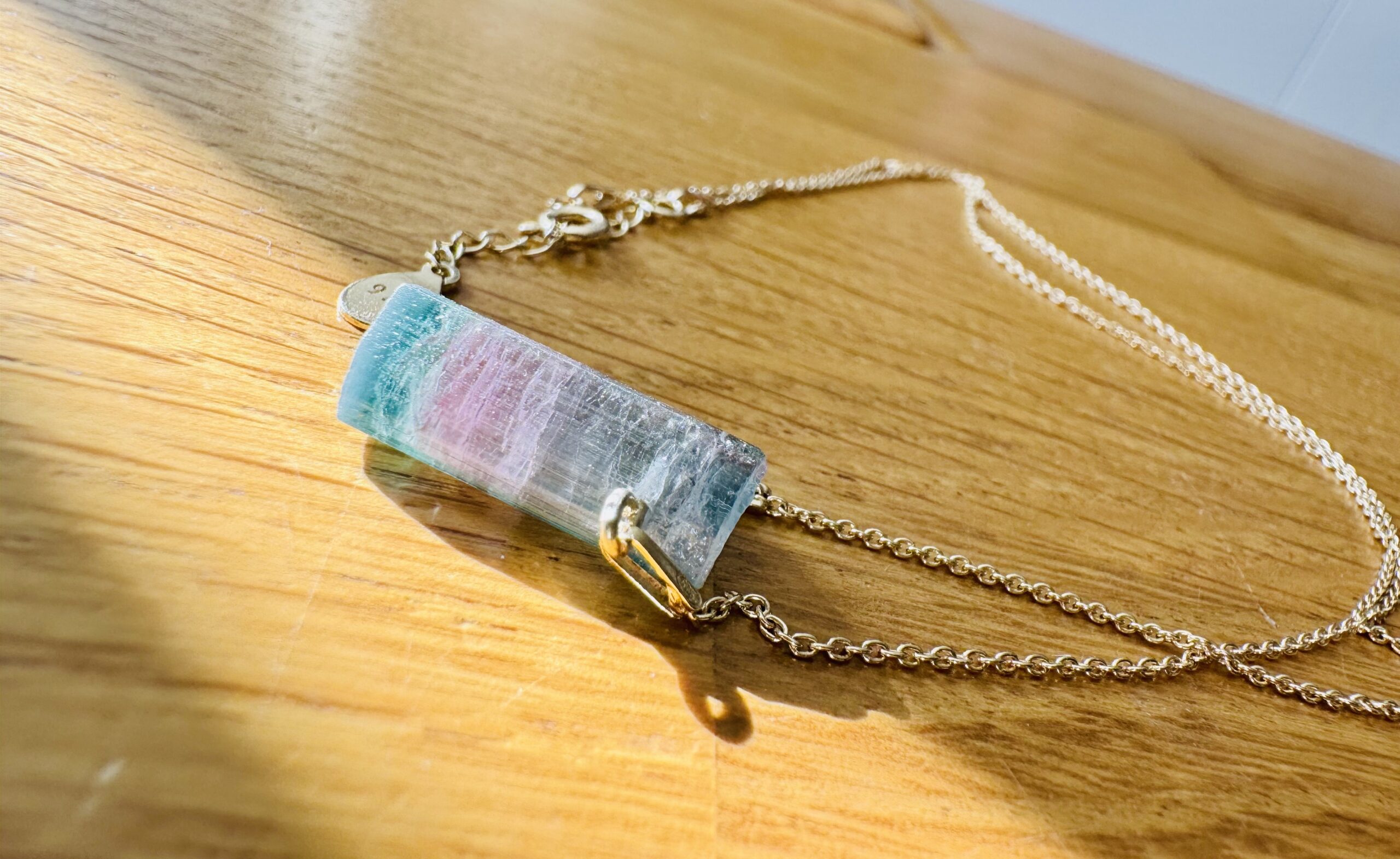 Naturalny Turmalin trójkolorowy wysokiej jakości – kryształ przechodzi od odcieni błękitu, przez delikatny róż, aż po zieleń.